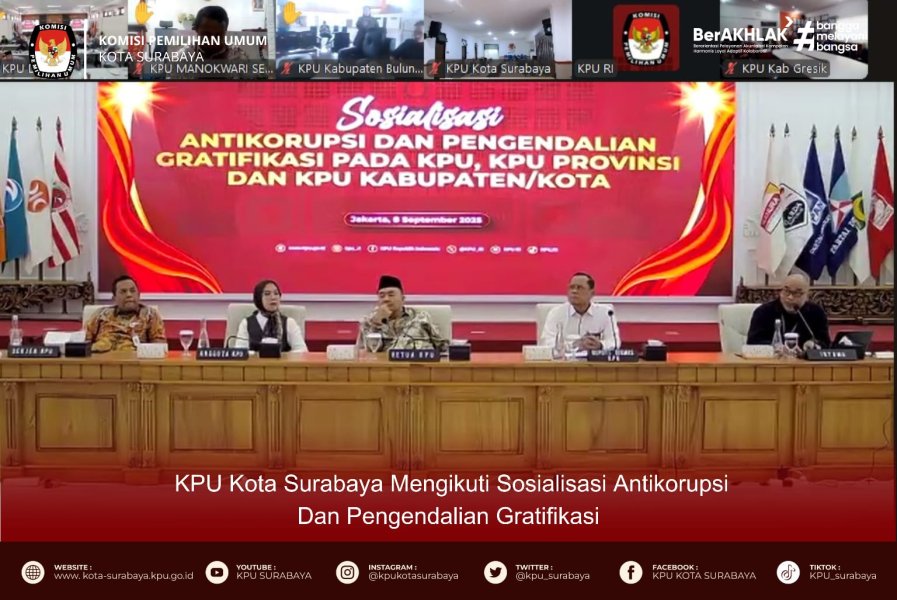 KPUSBY-Komisi Pemilihan Umum (KPU) Kota Surabaya mengikuti kegiatan Sosialisasi Antikorupsi dan Pengendalian Gratifikasi pada KPU, KPU Provinsi, dan KPU Kabupaten/Kota yang diadakan oleh KPU RI pada Senin, 8 September 2025. Kegiatan ini berlangsung di Ruang Rapat Lantai 2 Kantor KPU Kota Surabaya.