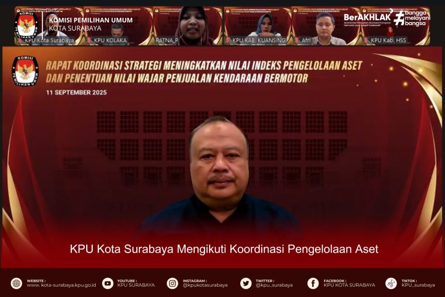 KPUSBY-Komisi Pemilihan Umum (KPU) Kota Surabaya mengikuti kegiatan Rapat Koordinasi (Rakor) Strategi Meningkatkan Pengelolaan Aset dan Penentuan Nilai Wajar Penjualan Kendaraan Bermotor yang diselenggarakan oleh KPU RI pada Kamis, 11 September 2025 mulai pukul 08.15 sampai dengan pukul 10.20 WIB. Kegiatan ini diikuti KPU Kota Surabaya secara daring melalui Zoom Meeting dari ruang rapat lantai 1.