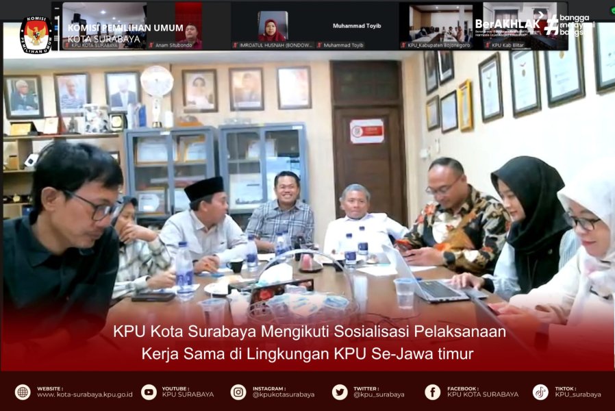 KPUSBY-Komisi Pemilihan Umum (KPU) Kota Surabaya mengikuti kegiatan Sosialisasi Pelaksanaan Kerja Sama di Lingkungan KPU Provinsi Jawa Timur dan KPU Kabupaten/Kota se-Jawa Timur pada Kamis, 11 September 2025 mulai pukul 09.15 sampai dengan pukul 12.40 WIB. Kegiatan yang diselenggarakan oleh KPU Provinsi Jawa Timur ini diikuti secara daring dari Ruang Rapat Lantai 2 Kantor KPU Kota Surabaya.