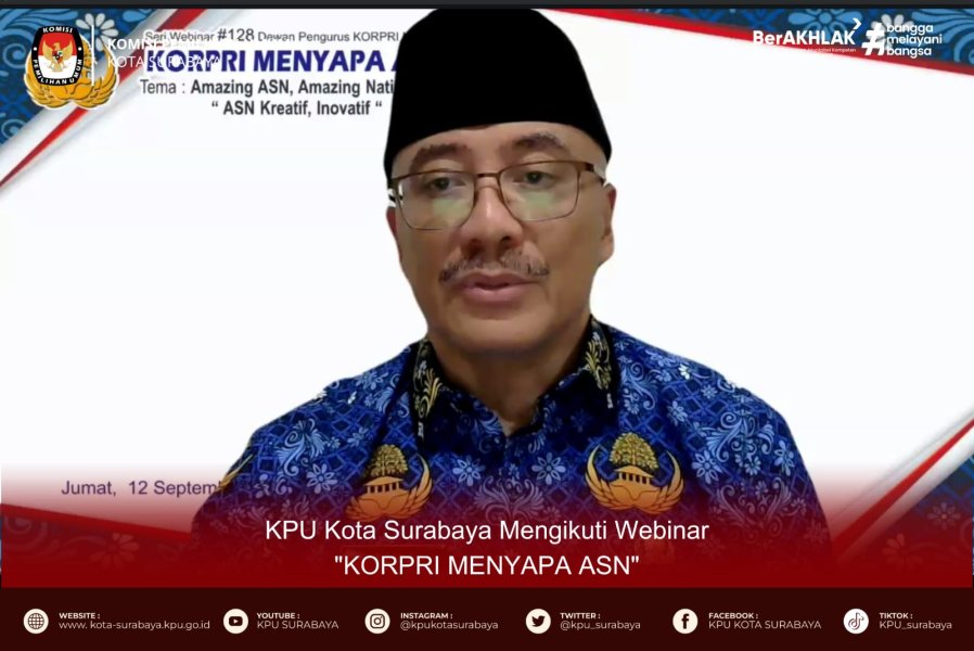 KPUSBY-Komisi Pemilihan Umum (KPU) Kota Surabaya mengikuti Seri Webinar #128 KORPRI Menyapa ASN dengan tema "Amazing ASN, Amazing Nation (13) : ASN Kreatif, Inovatif" pada Jum'at, 12 September 2025 mulai pukul 13.10 sampai dengan 14.55 WIB secara daring di Ruang Rapat Lantai 2 Kantor KPU Kota Surabaya.