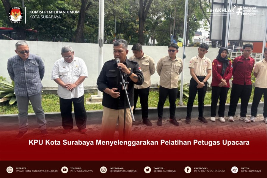 KPUSBY-Komisi Pemilihan Umum (KPU) Kota Surabaya menyelenggarakan Pelatihan Petugas Upacara pada Rabu, 29 Oktober 2025 di halaman kantor KPU Kota Surabaya. Kegiatan ini bekerja sama dengan Badan Kesatuan Bangsa dan Politik (Bakesbangpol) Kota Surabaya serta Duta Pancasila Paskibraka Indonesia (DPPI) Kota Surabaya.