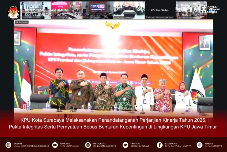 Komisi Pemilihan Umum (KPU) Kota Surabaya mengikuti Penandatanganan Perjanjian Kinerja, Pakta Integritas, Serta Pernyataan Bebas Benturan Kepentingan di lingkungan KPU Provinsi Jawa Timur yang dilaksanakan pada Kamis, 8 Januari 2026 di ruang rapat lantai 2 KPU Kota Surabaya secara daring.