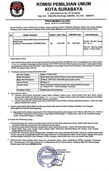 PENGUMUMAN PENJUALAN LELANG SECARA (OPEN BIDDING) ATAS BARANG MILIK NEGARA BERUPA CLINICAL THERMOMETER (THERMOGUN)