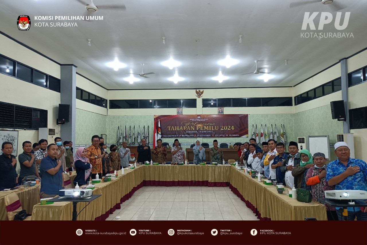 Surabaya, kota-surabaya.kpu.go.id - Selasa malam (14/6), KPU Surabaya menyelenggarakan Nonton Bersama Peluncuran Tahapan Pemilu 2024 di Graha Swara kantor KPU Surabaya. Kegiatan yang berlangsung selama 2 jam ini turut dihadiri oleh Ketua dan Anggota Bawaslu Surabaya, Forkopimda Surabaya, Partai Politik tingkat Kota Surabaya, serta perwakilan media.