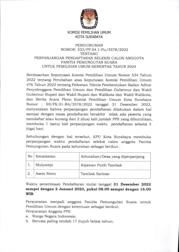 Halo #TemanPemilih, Berikut adalah Pengumuman Perpanjangan Pendaftaran Seleksi Calon Anggota Pemungutan Suara Untuk Pemilihan Serentak Tahun 2024