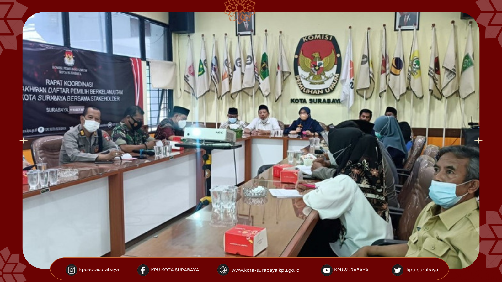 Surabaya, kota-surabaya.kpu.go.id – Selasa siang (29/03/2022), KPU Surabaya menyelenggarakan Rapat Koordinasi (Rakor) Pemutakhiran Data Pemilih Berkelanjutan (DPB). Rapat yang rutin digelar tiap 3 bulan ini dihadiri oleh Bawaslu Surabaya dan pemangku kepentingan lainnya seperti Polrestabes Surabaya, Polres Pelabuhan Tanjung Perak, Korem 084/Bhaskara Jaya, Kejaksaan Negeri Tanjung Perak, Dispenduk Capil Kota Surabaya, Bakesbangpol dan Linmas Surabaya, Dinas Pendidikan Provinsi Jawa Timur, dan Kementerian Agama Kota Surabaya.