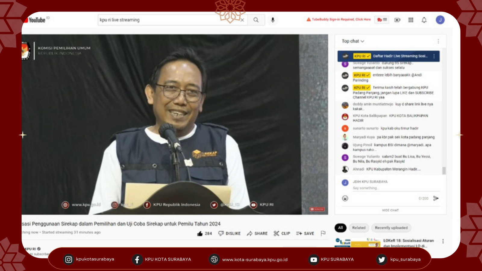 Surabaya, kota-surabaya.kpu.go.id – Rabu siang (30/3), KPU Surabaya mengikuti Live Streaming Sosialisasi Penggunaan SIREKAP dalam Pemilihan dan Uji Coba SIREKAP untuk Pemilu Tahun 2024. Kegiatan yang dilaksanakan di Banda Aceh ini dibuka oleh Anggota KPU RI, I Dewa Kade Wiarsa Raka Sandi bersama Evi Novida Ginting Manik.