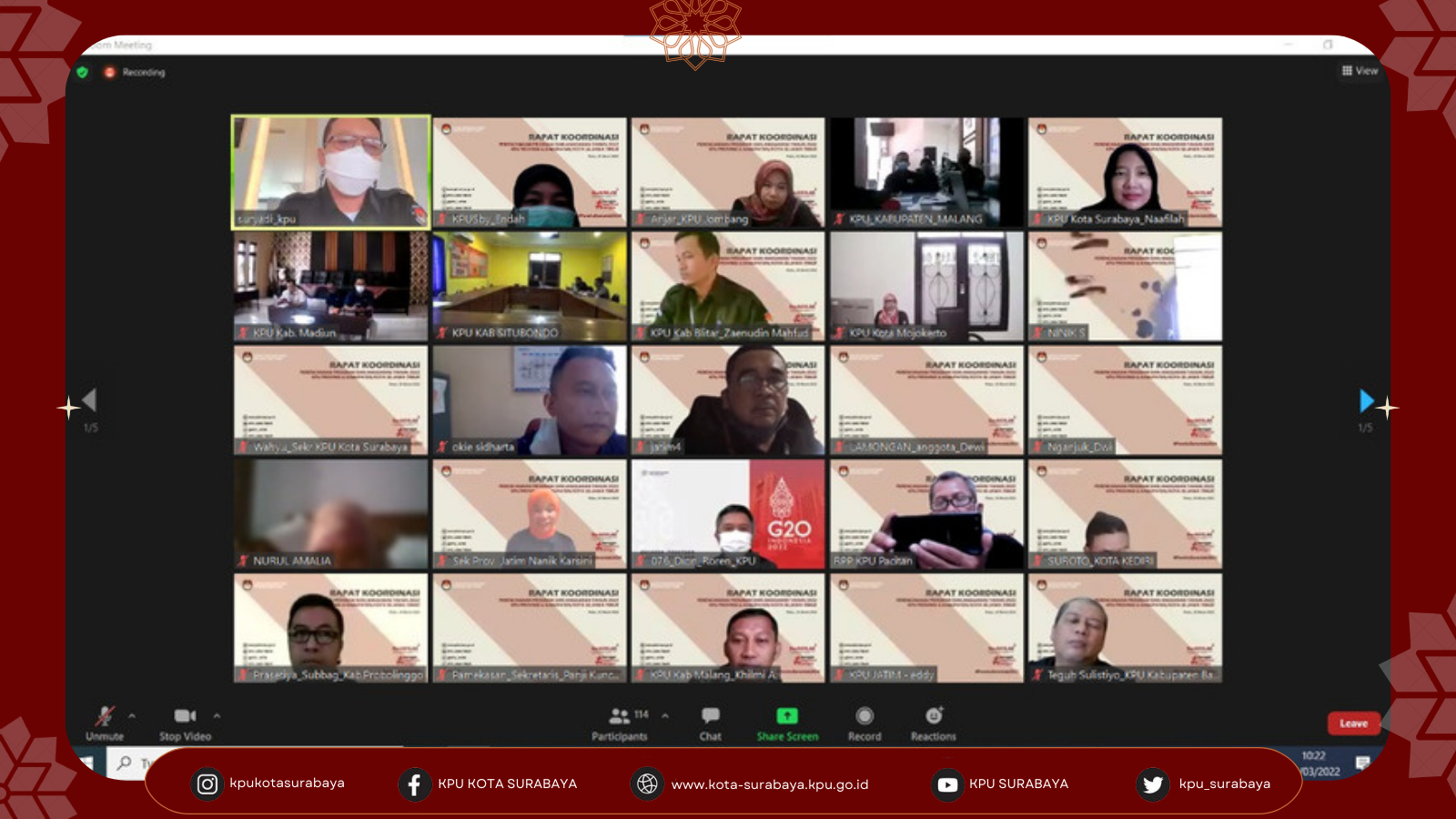 Surabaya, kota-surabaya.kpu.go.id – Rabu pagi (30/3), KPU Surabaya menghadiri Rapat Koordinasi (Rakor) Perencanaan Program dan Anggaran Tahun 2022 KPU Kabupaten/Kota se-Jawa Timur yang diselenggarakan oleh KPU Provinsi Jawa Timur. Rakor yang diselenggarakan secara daring ini diikuti oleh Anggota KPU Surabaya, Koordinator Divisi Perencanaan, Data, dan Informasi, Naafilah Astri Swarist, Sekretaris KPU Surabaya, Wahyu Rachmadani Setiawan, serta Kasubbag Perencanaan, Data dan Informasi, Endah Yuli Ekowati.