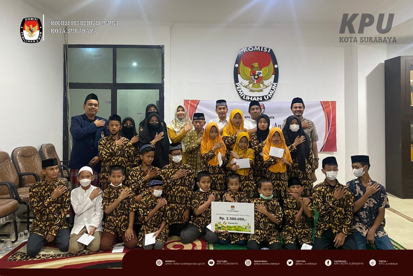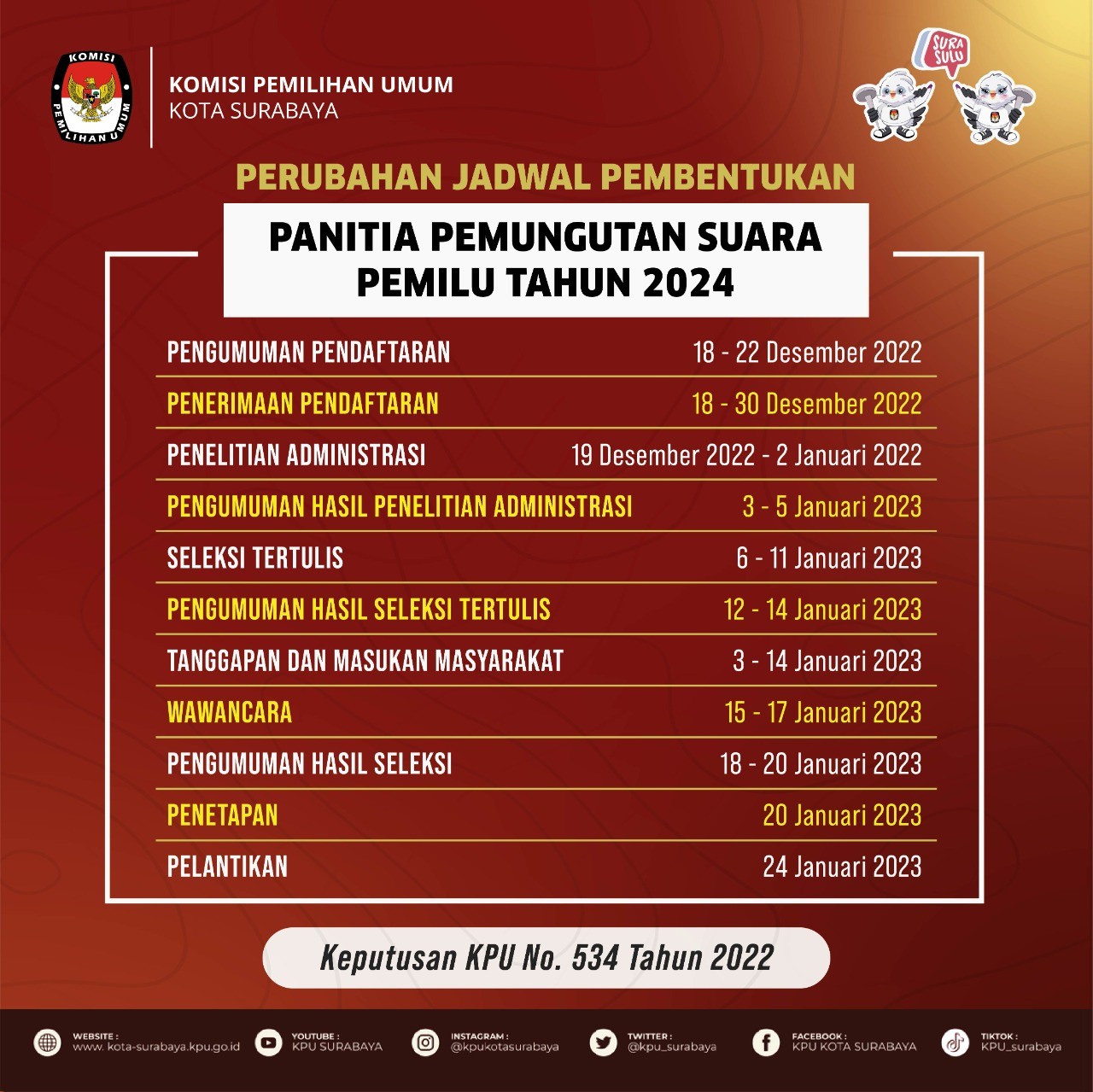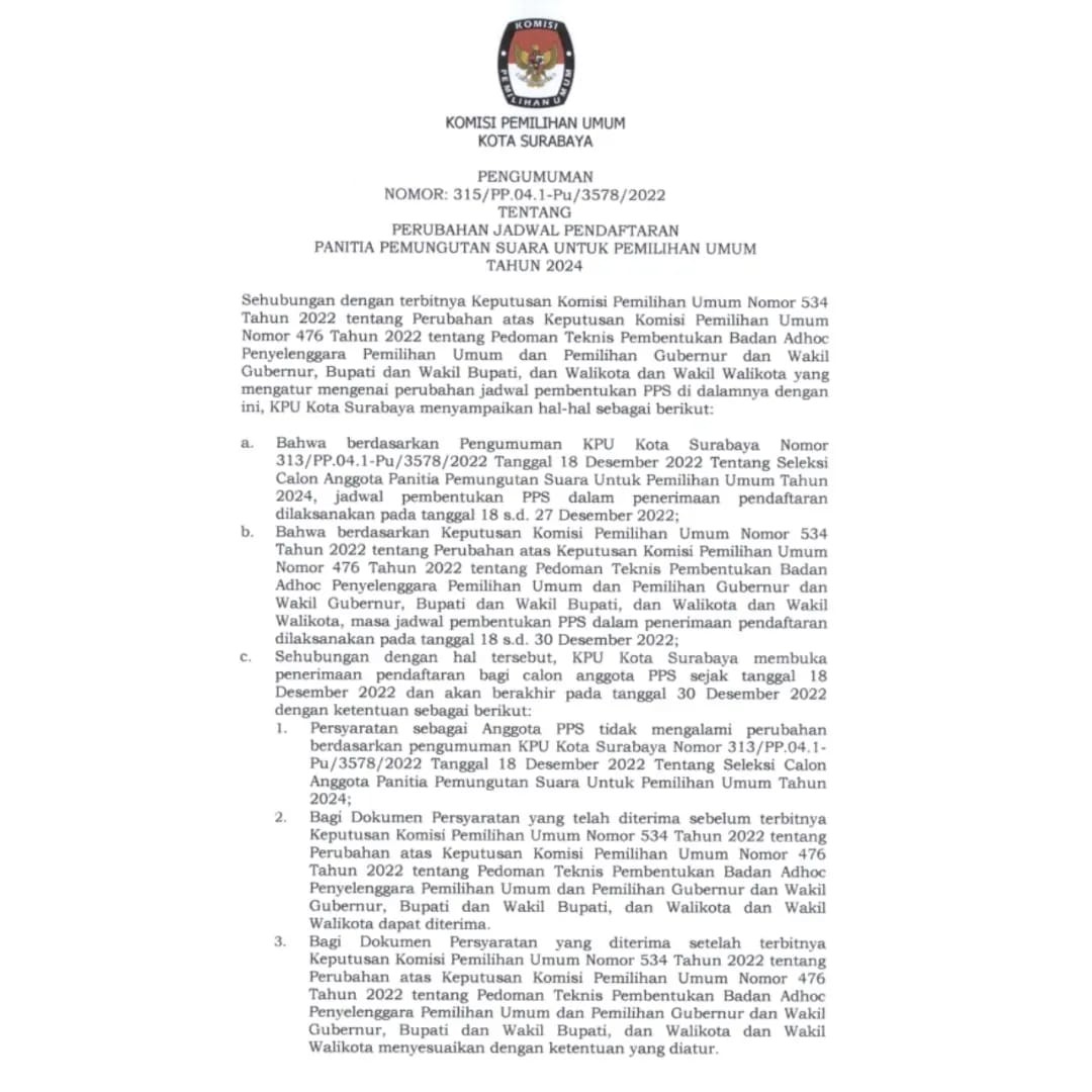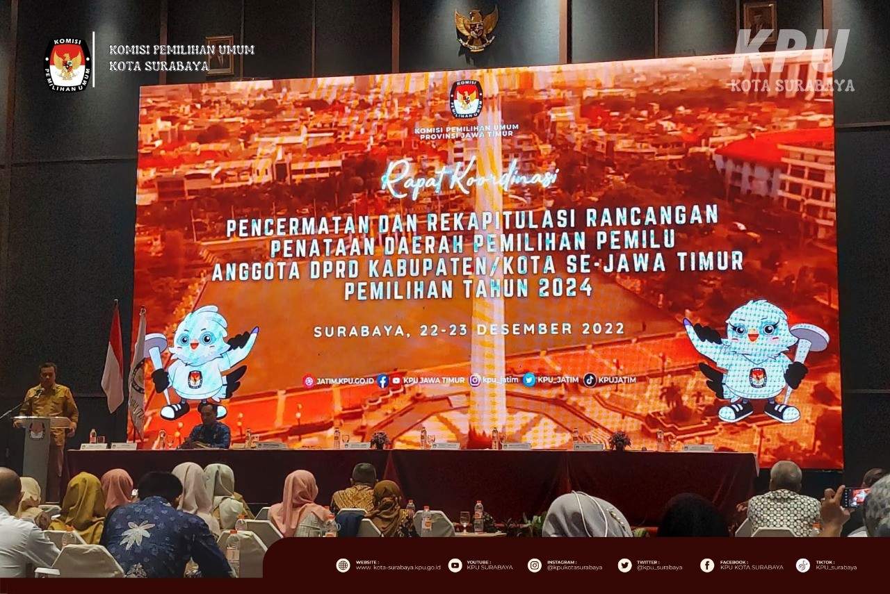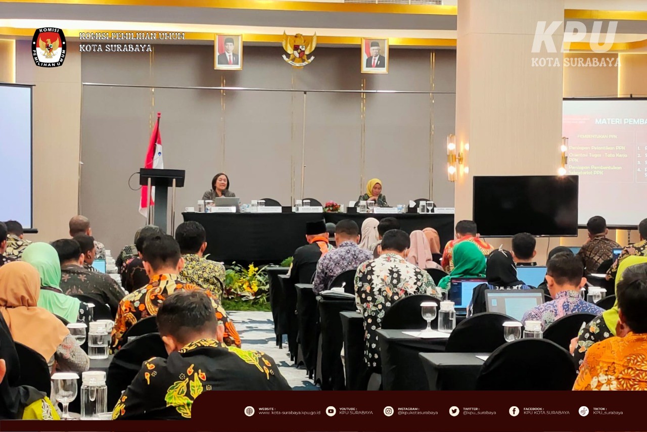 - Kamis (22/12), KPU Kota Surabaya menghadiri undangan KPU Provinsi Jawa Timur dalam rangka melaksanakan kegiatan bimbingan teknis tahapan pembentukan PPS pemilu. Undangan tersebut dihadiri oleh Divisi Sosialisasi Pendidikan Pemilih, Partisipasi masyarakat, dan Sumber Daya Manusia, Kepala Subbagian Hukum dan Sumber Daya Manusia, dan Operator SIAKBA. Audiensi ini dilaksanakan untuk Bimbingan Teknis Tahapan Pembentukan PPS.