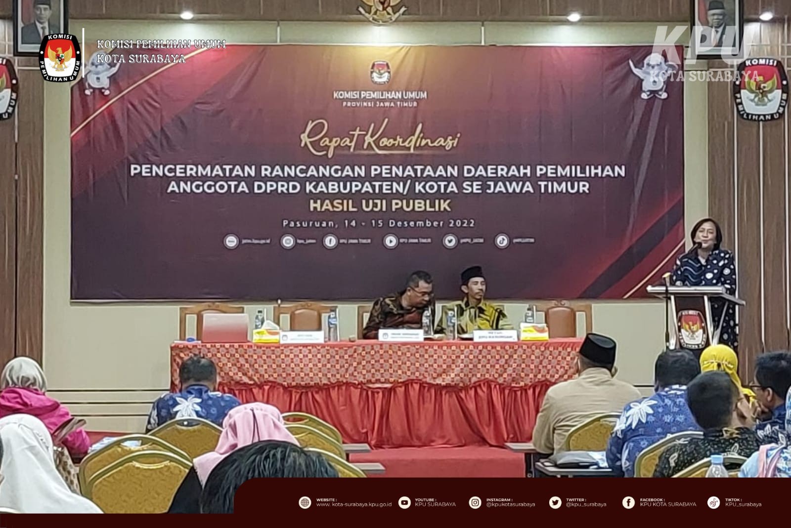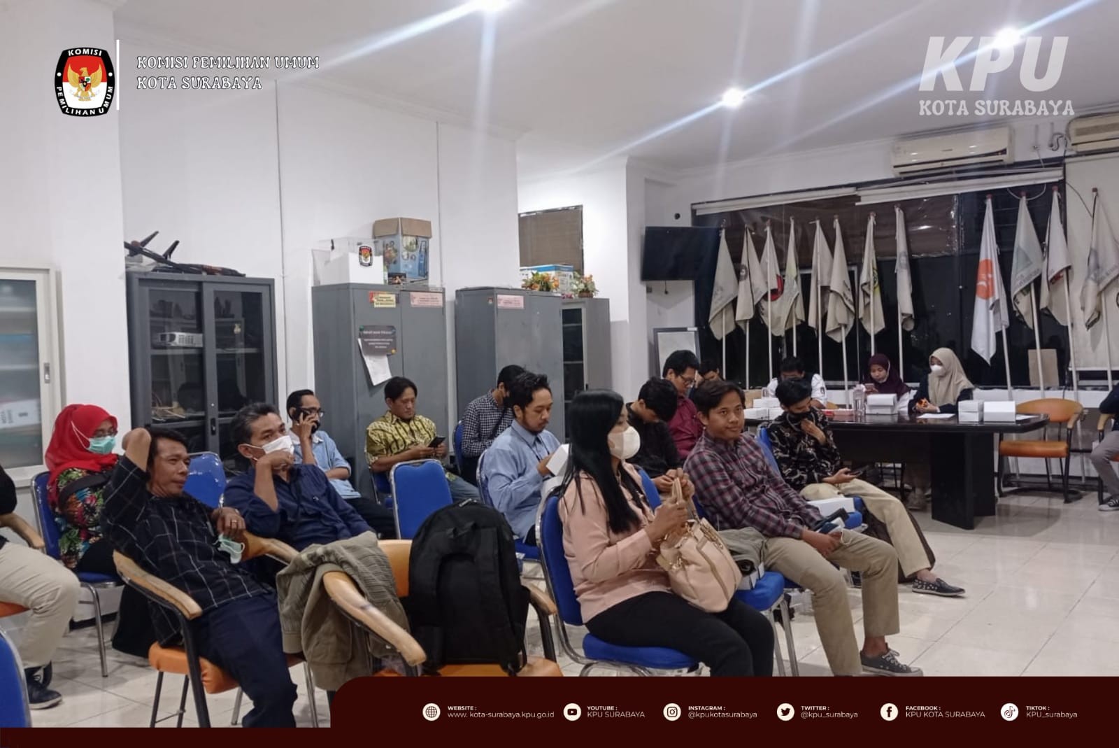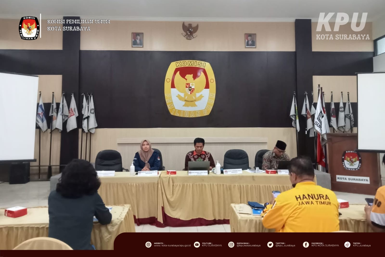 Surabaya, kota-surabaya.kpu.go.id - Selasa (13/12), KPU Kota Surabaya menggelar Uji Publik Rancangan Penataan Daerah Pemilihan (Dapil) dan Alokasi Kursi Anggota DPRD Kota Surabaya dalam Pemilu Tahun 2024 di Graha Swara KPU Kota Surabaya. Uji Publik ini dihadiri oleh jajaran instansi, Parpol di DPRD Kota Surabaya, Parpol Calon Peserta Pemilu 2024, dan Pemantau Pemilu yang terdaftar di KPU Kota Surabaya pada Pemilihan 2020 serta terdaftar di Bawaslu Kota Surabaya pada Pemilu 2024, juga Kris Nugroho selaku akademisi Universitas Airlangga yang menjadi narasumber Ketua Divisi Teknis Penyelenggaraan Pemilu, Soeprayitno memaparkan mengenai alur penataan Dapil dan alokasi kursi anggota DPRD mulai dari penerimaan dan pencermatan DAK2, data wilayah, serta peta wilayah hingga penetapan. Ia juga menjelaskan bahwa penyusunan Dapil nantinya akan dilakukan sesuai prinsipnya, seperti kesetaraan nilai suara, ketaatan pada sistem Pemilu yang proposional, proporsionalitas, integralitas wilayah, berada dalam cakupan wilayah yang sama, kohesivitas dan kesinambungan. "Dalam menyusun daerah pemilihan, KPU akan memperhatikan prinsip-prinsip yang sudah diatur di UU No. 7 Tahun 2017 serta PKPU No. 6 Tahun 2022," terangnya.