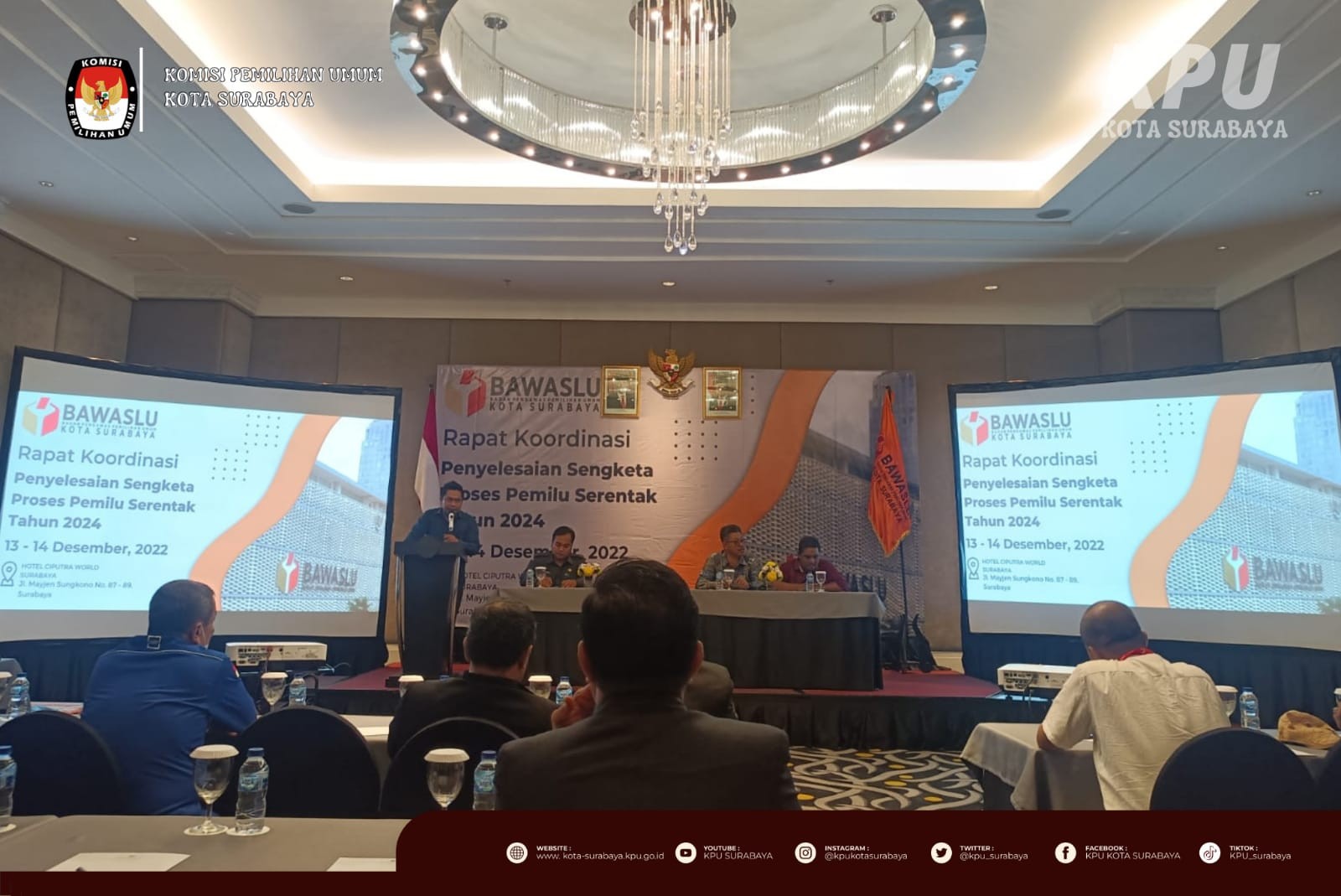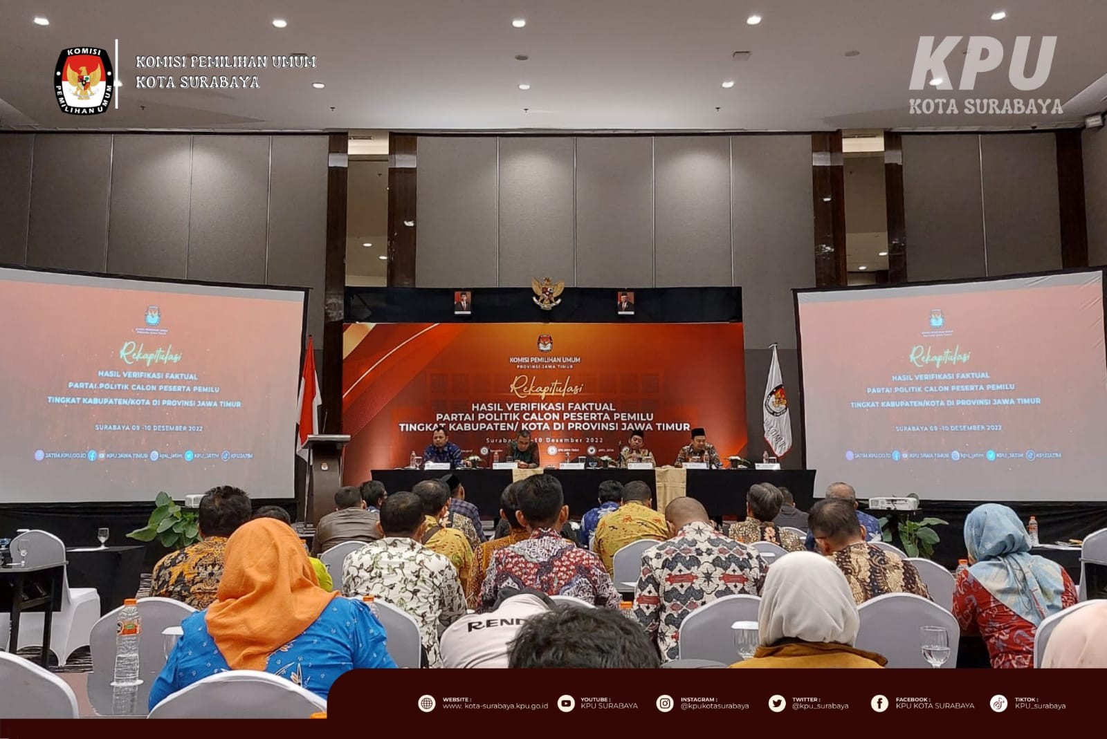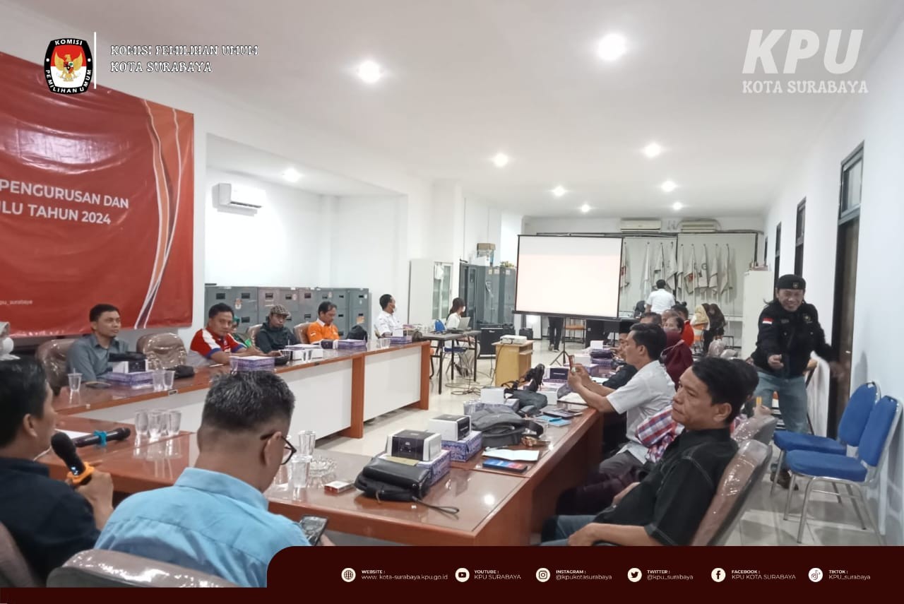 Surabaya, kota-surabaya.kpu.go.id - Selasa (13/12), KPU Kota Surabaya menggelar Uji Publik Rancangan Penataan Daerah Pemilihan (Dapil) dan Alokasi Kursi Anggota DPRD Kota Surabaya dalam Pemilu Tahun 2024 di Graha Swara KPU Kota Surabaya. Uji Publik ini dihadiri oleh jajaran instansi, Parpol di DPRD Kota Surabaya, Parpol Calon Peserta Pemilu 2024, dan Pemantau Pemilu yang terdaftar di KPU Kota Surabaya pada Pemilihan 2020 serta terdaftar di Bawaslu Kota Surabaya pada Pemilu 2024, juga Kris Nugroho selaku akademisi Universitas Airlangga yang menjadi narasumber Ketua Divisi Teknis Penyelenggaraan Pemilu, Soeprayitno memaparkan mengenai alur penataan Dapil dan alokasi kursi anggota DPRD mulai dari penerimaan dan pencermatan DAK2, data wilayah, serta peta wilayah hingga penetapan. Ia juga menjelaskan bahwa penyusunan Dapil nantinya akan dilakukan sesuai prinsipnya, seperti kesetaraan nilai suara, ketaatan pada sistem Pemilu yang proposional, proporsionalitas, integralitas wilayah, berada dalam cakupan wilayah yang sama, kohesivitas dan kesinambungan. "Dalam menyusun daerah pemilihan, KPU akan memperhatikan prinsip-prinsip yang sudah diatur di UU No. 7 Tahun 2017 serta PKPU No. 6 Tahun 2022," terangnya.