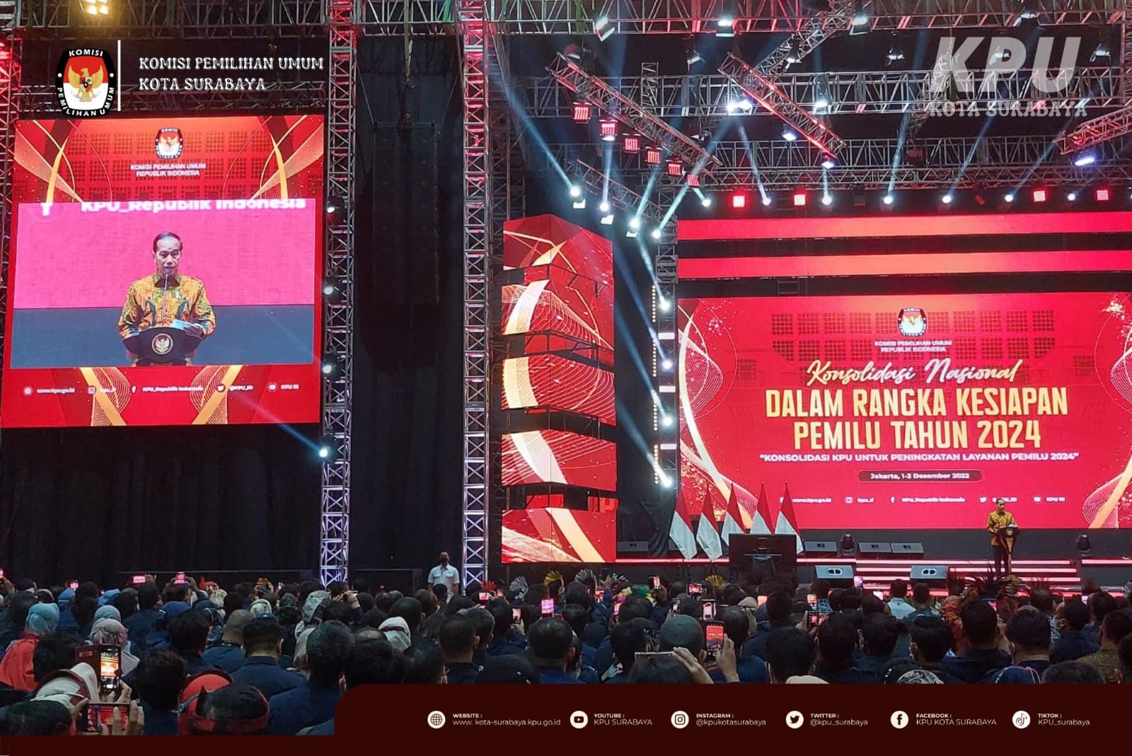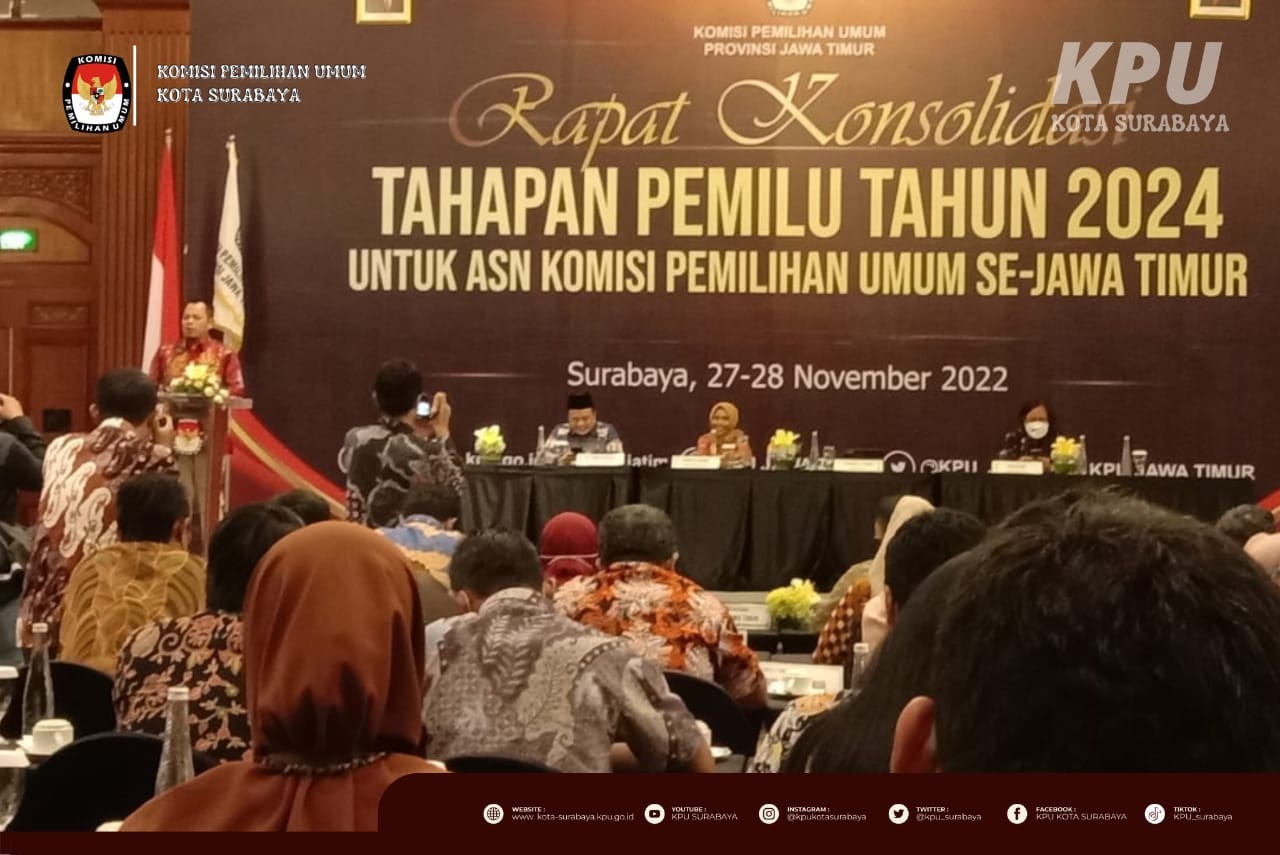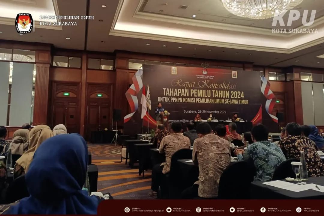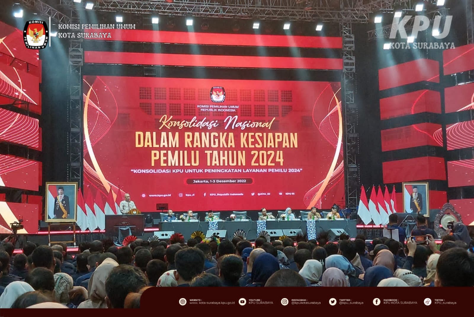 - Kamis (1/12), KPU Kota Surabaya menghadiri Rapat Konsolidasi Nasional dalam rangka kesiapan pelaksanaan Pemilu tahun 2024 yang diselenggarakan oleh KPU RI selama tiga hari di Ancol, Jakarta.