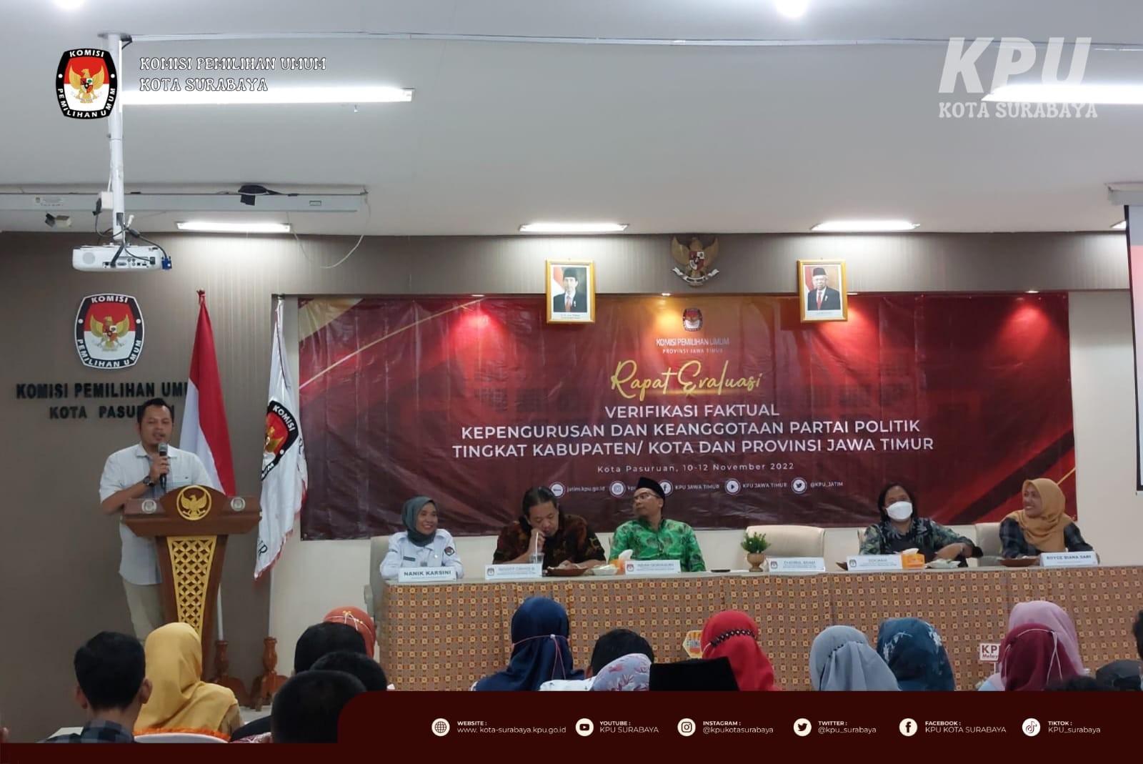 Pasuruan, kota-surabaya.kpu.go.id – Jumat (11/11), KPU Kota Surabaya hadiri Rapat Evaluasi Verifikasi Faktual Kepengurusan dan Keanggotaan Parpol yang diselenggarakan oleh KPU Provinsi Jawa Timur. Rapat yang dilaksanakan di Kantor KPU Kota Pasuruan ini dihadiri oleh Anggota, Kasubbag Teknis dan Hupmas, serta Verifikator Sipol KPU Kota Kabupaten/Kota Se-Jawa Timur.