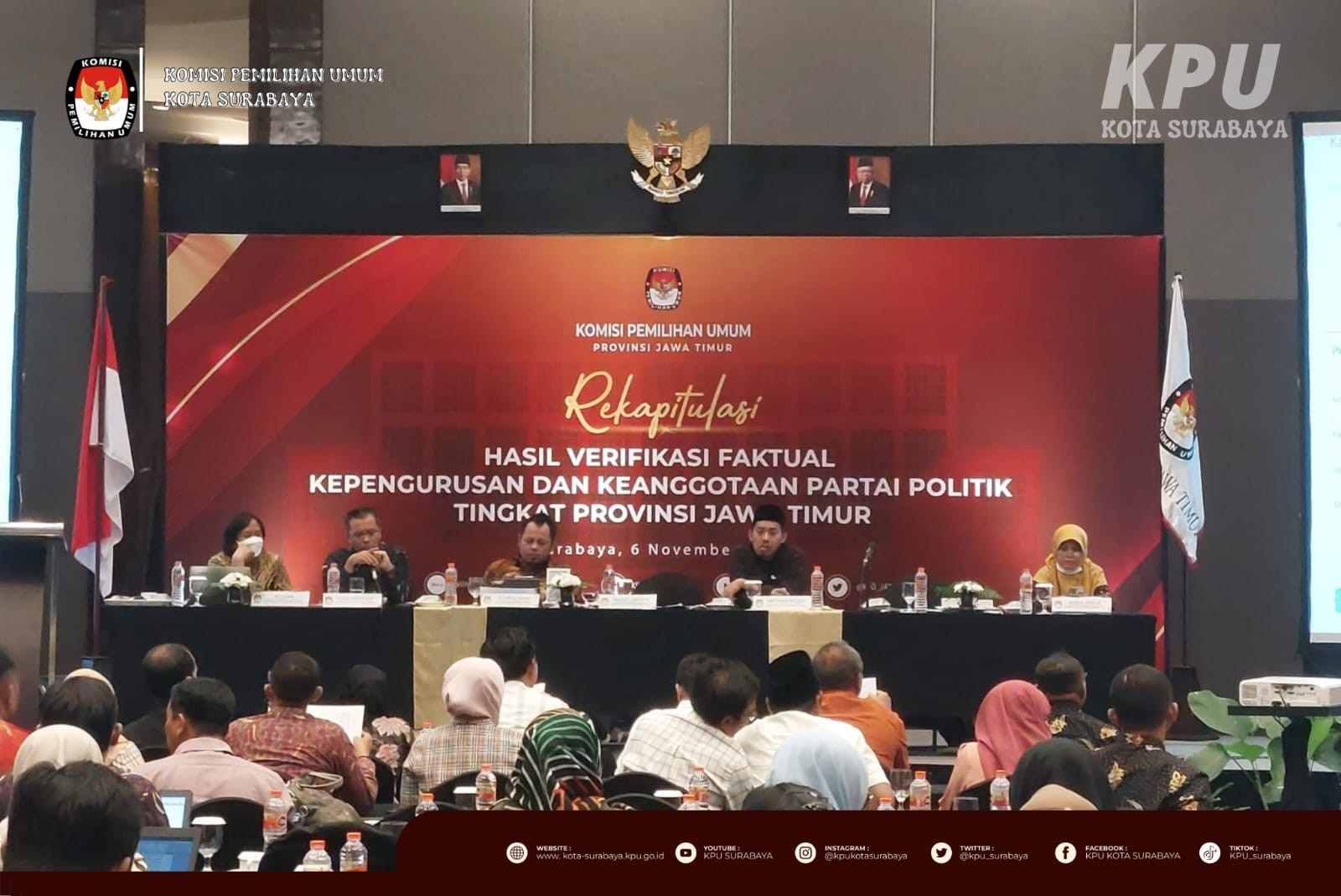 Surabaya, kota-surabaya.kpu.go.id – Minggu (6/11), KPU Surabaya menghadiri Rapat Koordinasi Persiapan dan Rekapitulasi Hasil Verifikasi Faktual yang diselenggarakan oleh KPU Jawa Timur. Kegiatan yang berlangsung selama 2 hari ini dihadiri oleh Ketua, Anggota, Sekretaris, Kasubbag Teknis dan Hupmas, dan Verifikator Sipol KPU Kabupaten/Kota se-Jawa Timur.