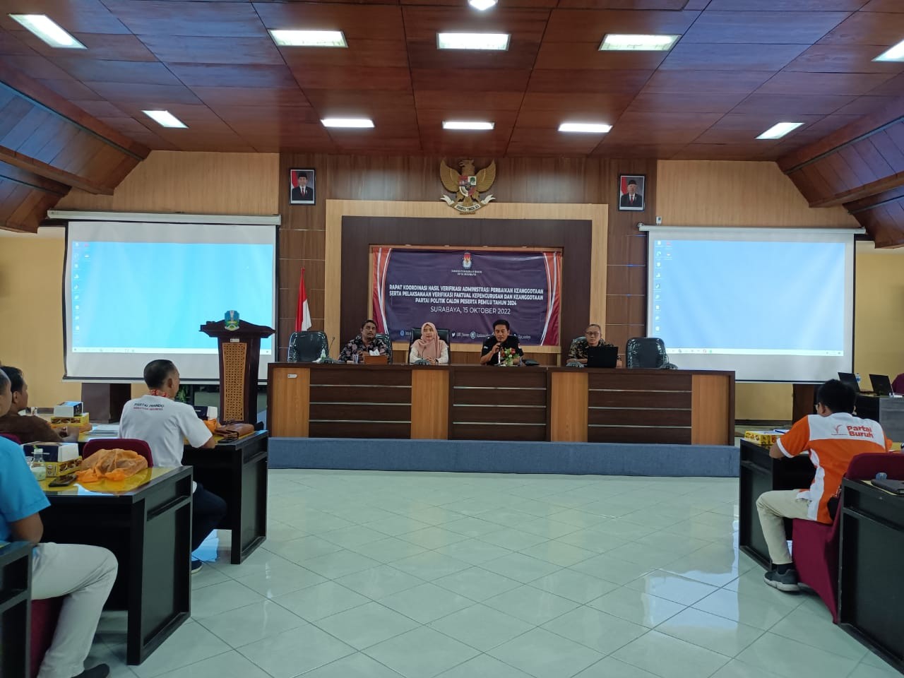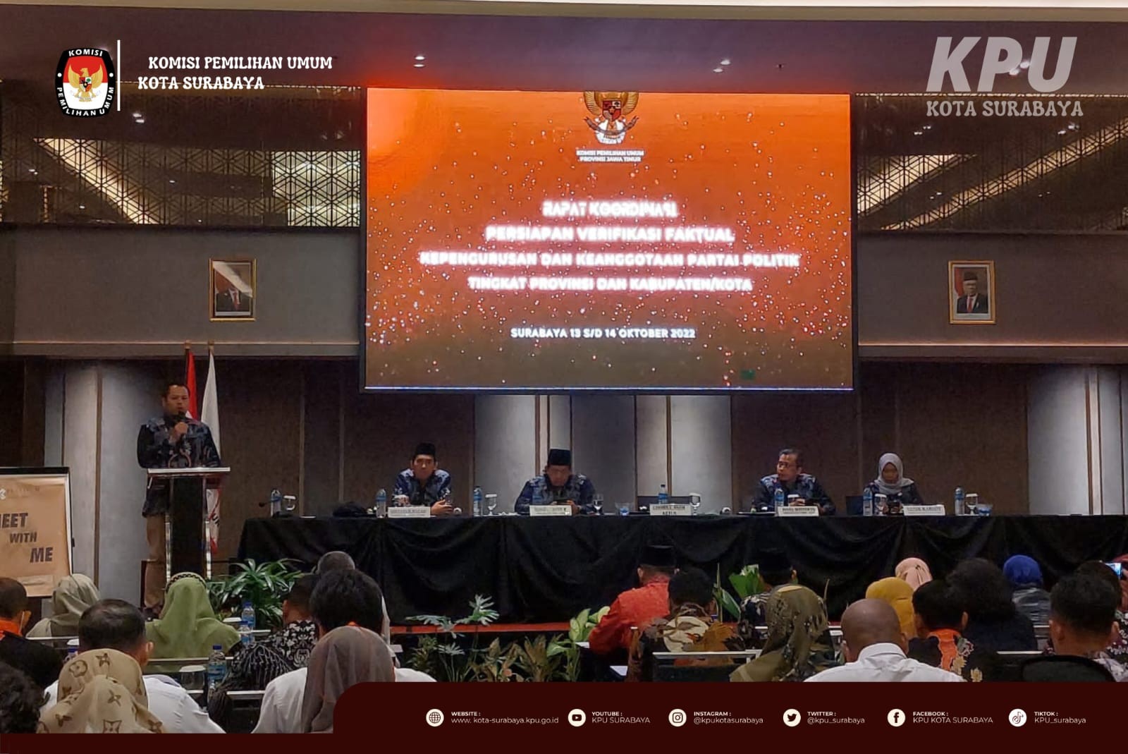 Kamis (13/10), KPU menghadiri Rapat Koordinasi Persiapan Verifikasi Faktual Kepengurusan dan Keanggotaan Partai Politik Tingkat Provinsi dan Kabupaten/Kota yang diselenggarakan oleh KPU Jawa Timur. Rapat Koordinasi yang diadakan selama 2 hari ini dihadiri oleh Ketua, Anggota Divisi Teknis Penyelenggaraan, Anggota Divisi Hukum dan Pengawasan, serta Kasubbag Teknis dan Hupmas KPU Kabupaten/Kota se-Jawa Timur.