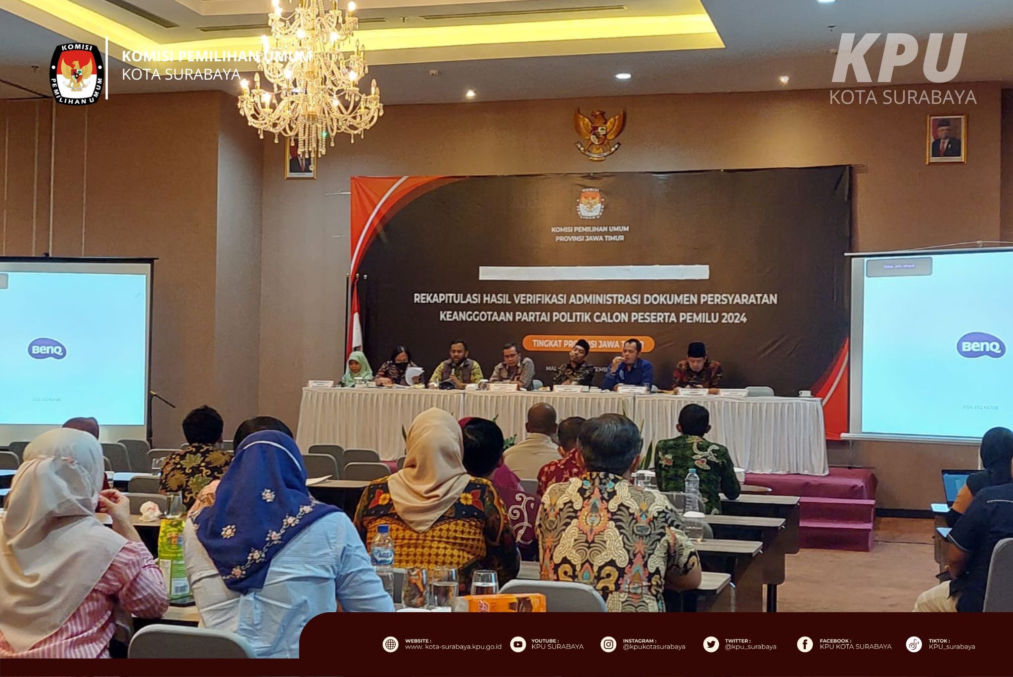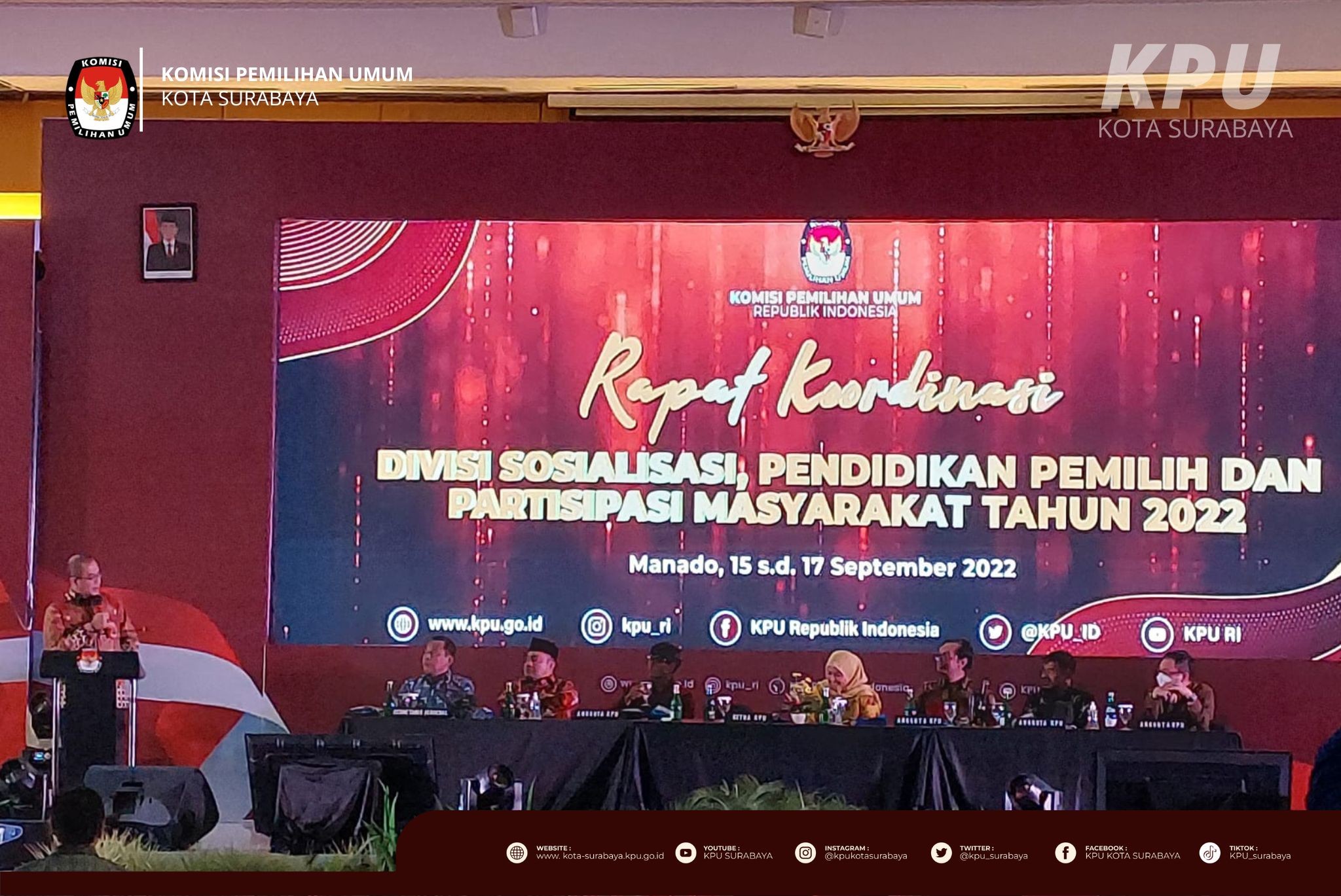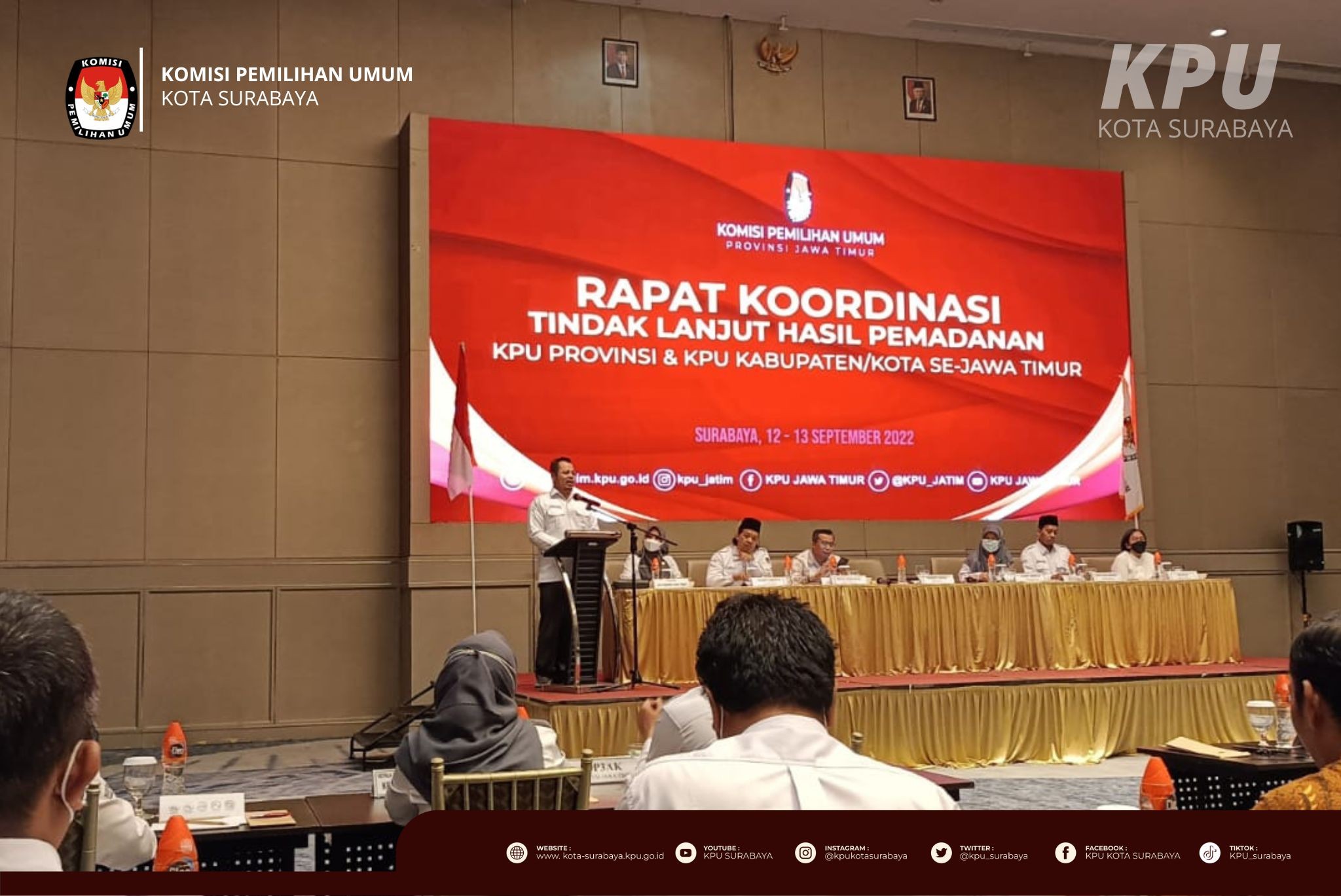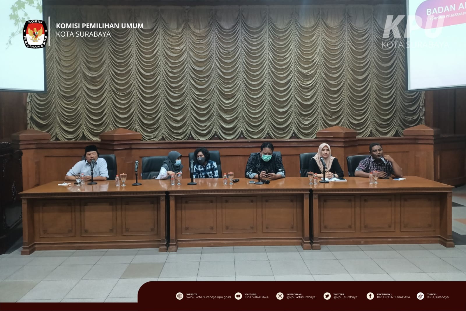 Surabaya, kota-surabaya.kpu.go.id - Kamis (15/9), KPU Surabaya menghadiri Sosialisasi Persiapan Pemilihan Umum Tahun 2024 di Kota Surabaya yang diselenggarakan oleh Pemerintah Kota Surabaya. Anggota KPU Surabaya, Ketua Divisi Perencanaan, Data dan Informasi, Naafilah Astri Swarist menyampaikan bahwa saat ini KPU Surabaya sedang melaksanakan Pemutakhiran Data Pemilih Berkelanjutan. Dari hasil pemadanan Data Pemilih Berkelanjutan Semester 2 Tahun 2021 KPU dan data kependudukan Kementerian Dalam Negeri, KPU Kabupaten/Kota diminta untuk melakukan validasi data pemilih. KPU Surabaya melaksanakan coklit terbatas (coktas) dan juga melakukan analisa terhadap data-data tersebut. KPU Surabaya berharap agar Pemerintah Kota Surabaya sebagai sesama pihak yang turut mensukseskan penyelenggaraan Pemilu dan Pemilihan 2024 dapat memberikan dukungan. "Melalui agenda sosialisasi ini, sinergi yang baik dapat terbangun demi data pemilih yang lebih akurat dan mutakhir," harap Naafilah Astri Swarist. Anggota KPU Jawa Timur, Ketua Divisi Data dan Informasi yang turut hadir juga menyampaikan harapannya agar Camat dan Lurah turut mendukung dan membantu jajaran KPU dalam memutakhirkan data pemilih, sehingga di masa mendatang data pemilih semakin baik dengan memperhatikan prinsip kehati-hatian terhadap data pemilih. Anggota KPU Surabaya, Ketua Divisi Hukum dan Pengawasan, Agus Turcham juga menyampaikan mengenai persiapan pembentukan sekretariat badan adhoc PPK dan PPS dengan memperhatikan pengalaman pada Pemilihan 2020 lalu.
