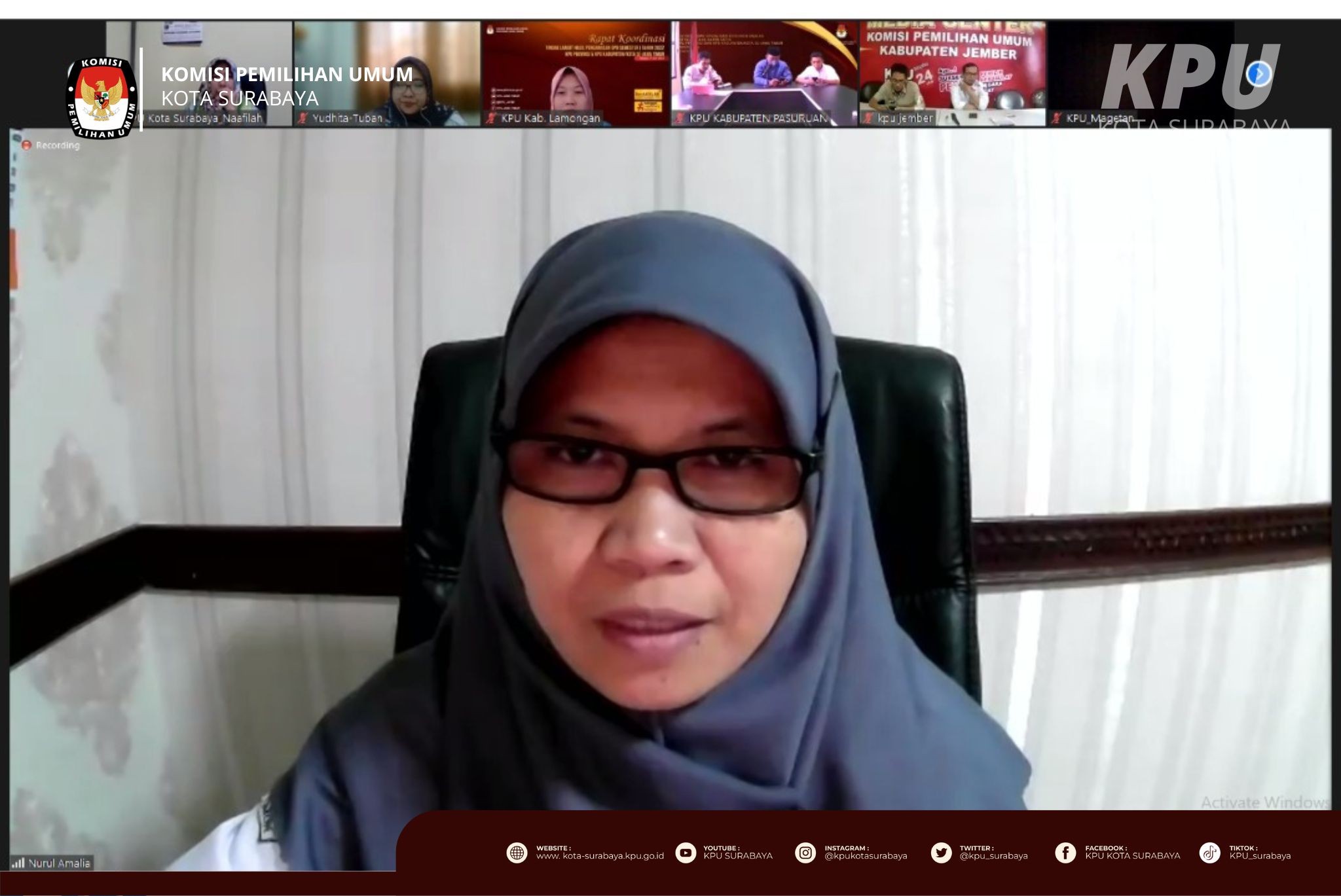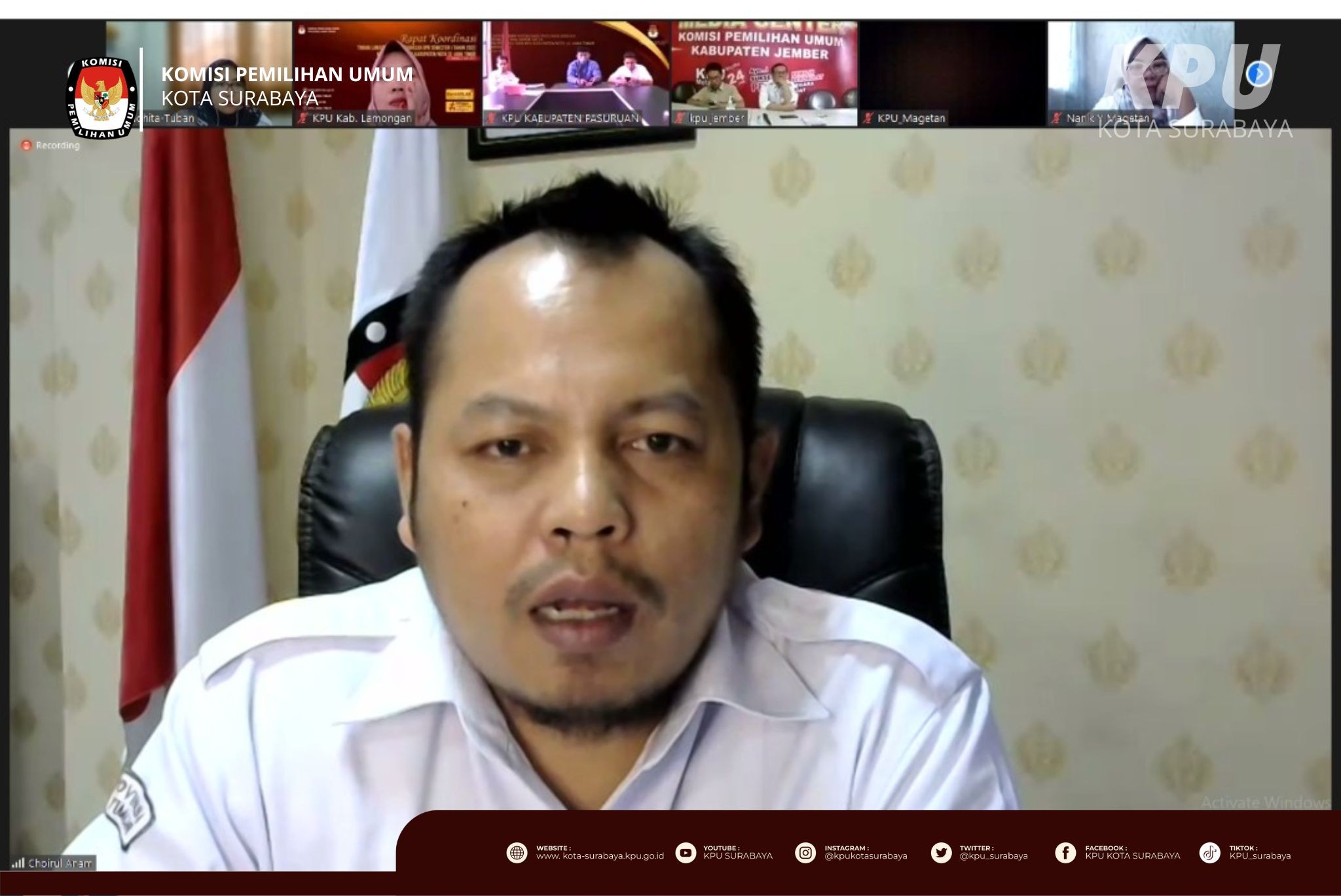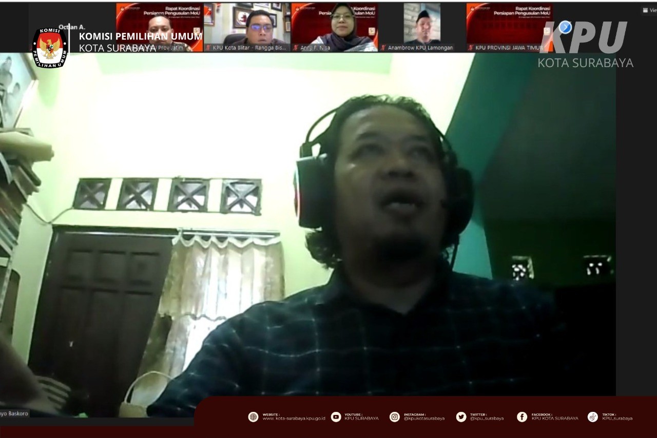 Surabaya, kota-surabaya.kpu.go.id – Senin sore (8/8), KPU Surabaya mengikuti Rapat Koordinasi DPB September 2022 untuk Sinkronisasi Data yang diselenggarakan oleh KPU Jawa Timur. Kegiatan yang dilaksanakan secara daring ini turut diikuti oleh Divisi Perencanaan, Data dan Informasi, Kepala Sub Bagian Perencanaan, Data dan Informasi, serta Operator Sidalih KPU Kabupaten/Kota di Jawa Timur. Ketua KPU Jawa Timur, Choirul Anam dalam sambutan pembukanya menyampaikan bahwa berdasarkan surat Kementerian Pendayagunaan Aparatur Negara dan Reformasi Birokrasi (Kementerian PAN-RB), KPU Jawa Timur menjadi satu-satunya satuan kerja yang dilakukan pemantauan dan pelayanan publik mengenai Data Pemilih Berkelanjutan, sehingga KPU Kabupaten/Kota perlu memaksimalkan kinerja layanan dan input data ke Sidalih harus valid. "Proses pemutakhiran data pemilih menjadi acuan untuk melakukan verifikasi kegandaan administrasi keanggotaan Partai Politik," ujar Choirul Anam. Dalam kegiatan yang berlangsung sekitar 2,5 jam ini, Choirul Anam meminta agar KPU Kabupaten/Kota menindaklanjuti dengan maksimal terhadap data-data yang sudah diturunkan oleh KPU RI, baik pemilih meninggal dan ganda.