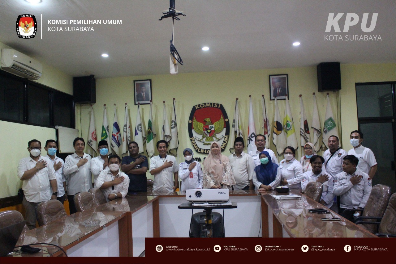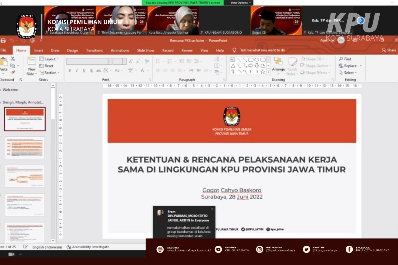 Surabaya, kota-surabaya.kpu.go.id – Selasa pagi (28/6), KPU Surabaya mengikuti Rapat Sosialisasi Tahapan Pemilu dan Pelaksanaan Perjanjian Kerjasama yang diselenggarakan oleh KPU Jawa Timur. Kegiatan yang dilaksanakan secara daring ini turut diikuti oleh Ketua Divisi Sosialisasi, Pendidikan Pemilih, Partisipasi Masyarakat, dan SDM serta Kasubbag Teknis Penyelenggaraan Pemilu, Partisipasi dan Hubungan Masyarakat KPU Kabupaten/Kota se-Jawa Timur. Anggota KPU Jawa Timur, Ketua Divisi Sosialisasi, Pendidikan Pemilih dan Partisipasi Masyarakat, Gogot Cahyo Baskoro menyampaikan 2 materi sekaligus, yaitu Tahapan dan Jadwal Penyelenggaraan Pemilu Tahun 2024 serta Ketentuan dan Rencana Pelaksanaan Kerjasama di Lingkungan KPU Provinsi Jawa Timur. "Pada prinsipnya, program dan kegiatan sosialisasi dapat dilaksanakan sepanjang waktu, pada masa sebelum, saat, dan sesudah tahapan Pemilu," ujar Gogot Cahyo Baskoro. Dalam kegiatan yang berlangsung sekitar 2 jam tersebut, Sekretaris KPU Jawa Timur, Nanik Karsini turut menyampaikan arahan bahwa sebagaimana Surat Edaran Nomor 5 Tahun 2022, seluruh pegawai wajib melaksanakan piket dan mengaktifkan handphone selama 24 jam.