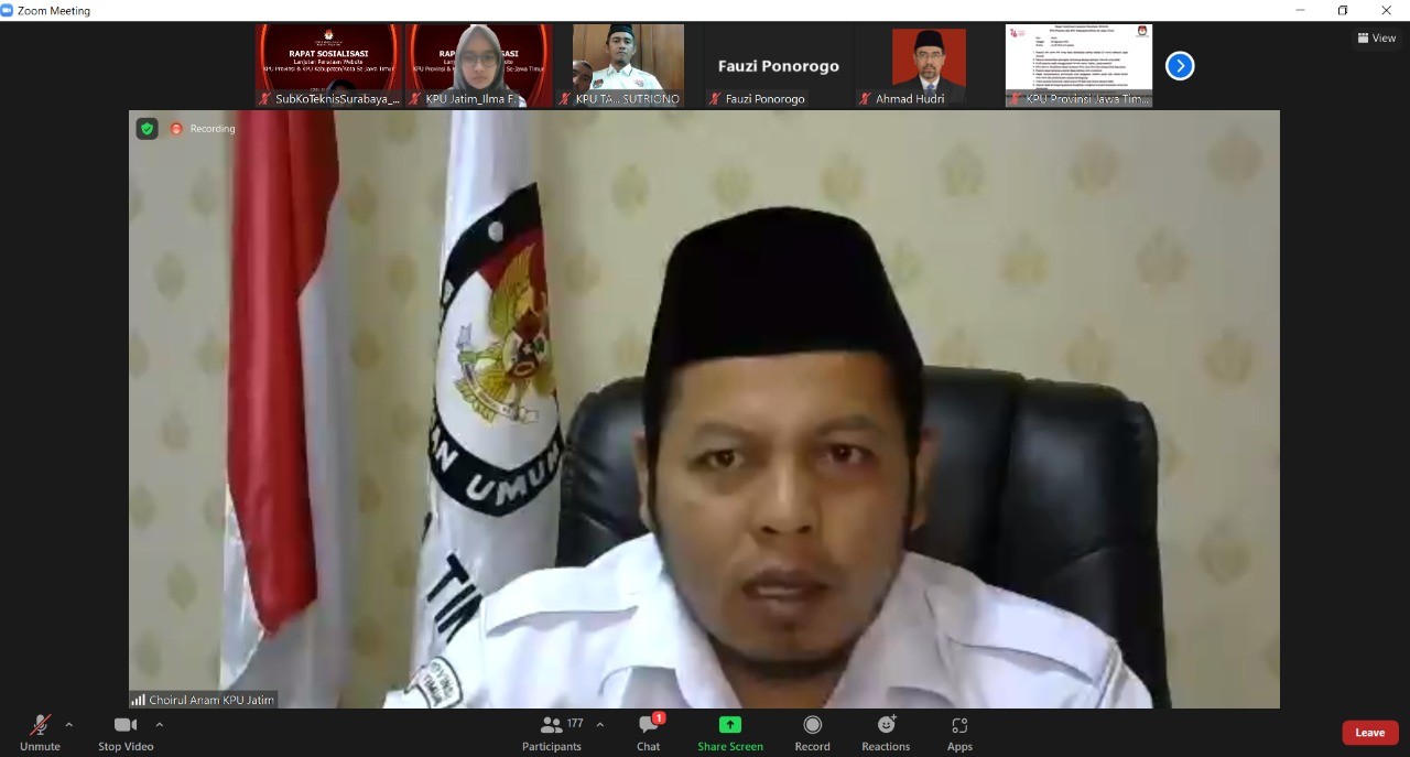 Choirul Anam, Ketua KPU Provinsi Jawa Timur membuka acara rapat koordinasi lanjutan yang diikuti oleh Ketua KPU Kabupaten/Kota se-Jatim, Anggota KPU Divisi Perencanaan, Data dan Informasi, Anggota KPU Divisi Sosdiklih, SDM dan Parmas, Sub Koordinator/Kasubbag Teknis dan Hupmas, serta Sub Koordinator/Kasubbag Program dan Data.