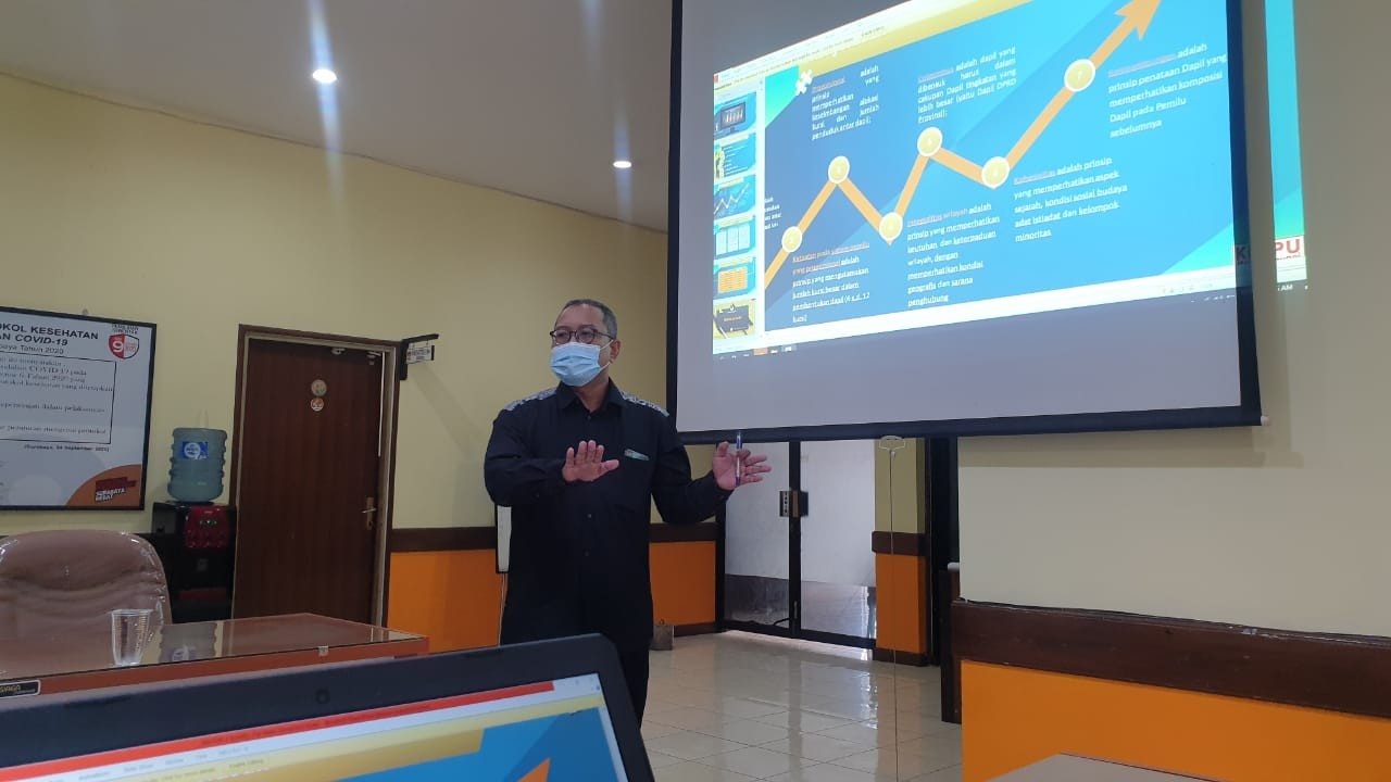 Pria yang akrab disapa Pak Nano ini mempresentasikan materi tentang penataan dapil, proses dan mekanisme penataan dapil untuk menyosong persiapan Pemilu Tahun 2024.