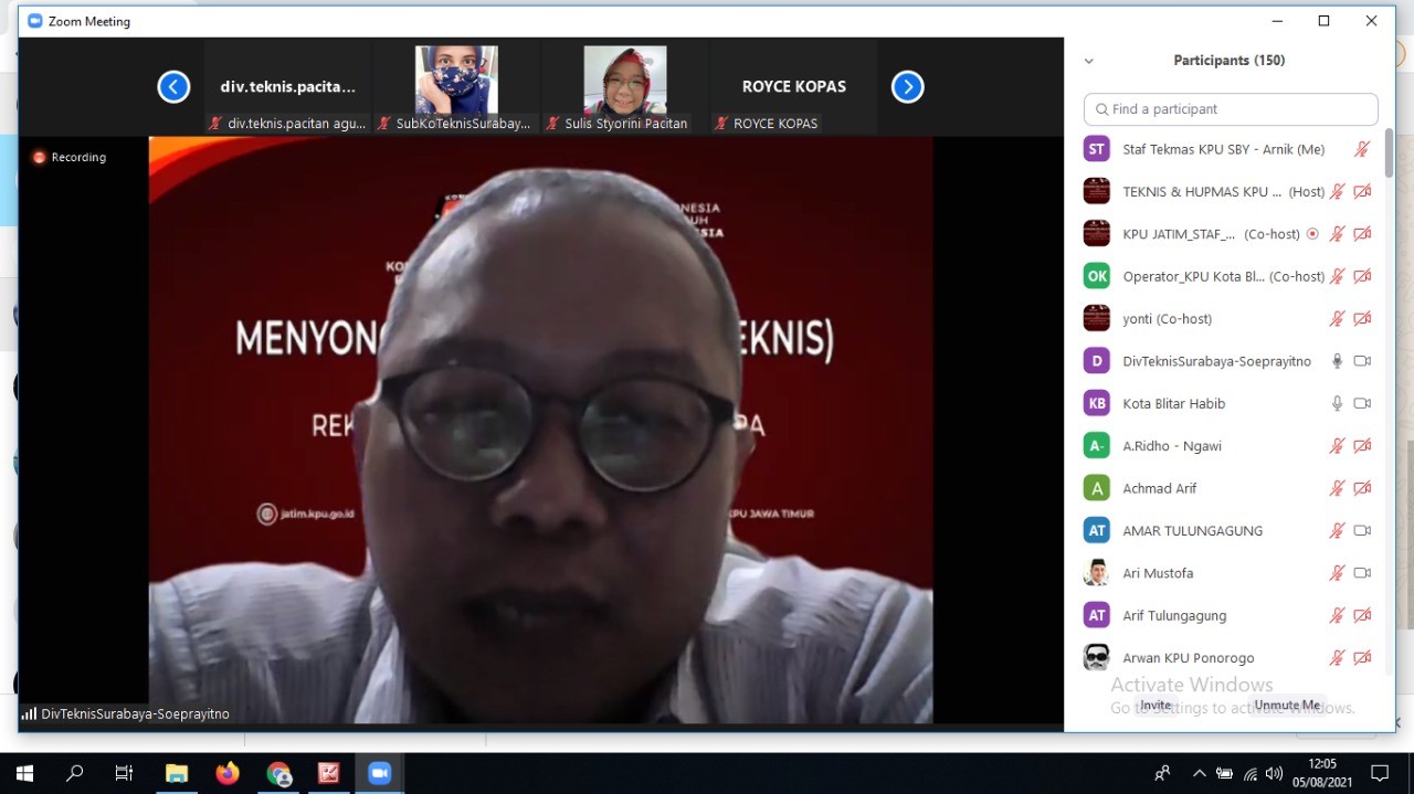 Hupmas, SURABAYA – Kelas Teknis yang digagas oleh KPU Provinsi Jawa Timur sudah menginjak SLsesi keenam. Sesi keenam ini dilaksanakan Kamis (05/08/2021) pukul 10.00 WIB sampai dengan pukyl 12.30 WIB. Kegiatan yang dilaksanakan secara daring tersebut diikuti oleh 38 KPU Kabupaten/Kota se-Jawa Timur. Yang menjadi peserta tidak hanya Divisi Teknis Penyelenggaraan namun semua Divisi dapat turut berpatisipasi. Narasumber pertama pada sesi keenam ini dari Divisi Teknis Penyelenggaraan KPU Kota Blitar, Hernawan M Khabib yang menjelaskan tentang Proses Rekapitulasi Hasil Penghitungan Perolehan Suara Pemilu dan Lika-Liku Di Masa Pandemi. Lanjut pemateri kedua yang mengambil tema Proses Rekapitulasi Hasil Penghitungan Perolehan Suara Tingkat Kabupaten/ Kota yang disampaikan oleh Anggota KPU Kabupaten Pacitan, Agus Susanto. Acara hari ini dimoderatori oleh staf pada Subbagian Teknis Pemilu dan Hupmas KPU Kota Blitar, One Amalia Asna. Hadir dari KPU Kota Surabaya Divisi Teknis Penyelenggaraan Soeprayitno, Sub Koordinator KPU Kota Surabaya, Endang Sri Arti Rahayu, dan Staf Teknis Arnik April Susanti. Sesi terakhir dalam acara Kelas Teknis seperti biasa dilanjutkan dengan tanggapan, berbagi pengalaman, dan tanya-jawab antara narasumber dan peserta yang ikut dalam kelas virtual ini. (aas/esar/hupmas)