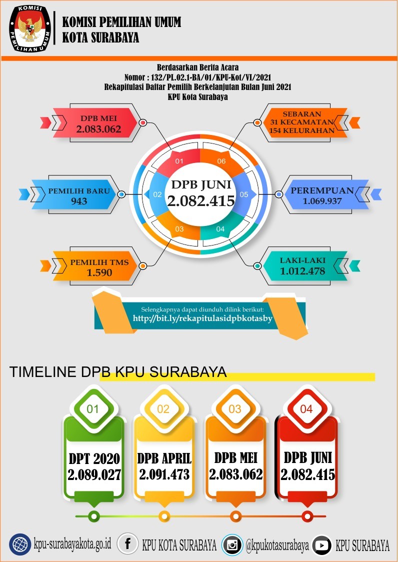 Hupmas, SURABAYA – Menindaklanjuti Surat KPU RI Nomor 366/PL.02-SD/01/KPU/IV/2021 perihal Perubahan Surat KPU Nomor 132/PL.02-SD/01/KPU/II/2021 perihal Pemutakhiran Data Pemilih Berkelanjutan Tahun 2021, KPU Surabaya menggelar Rapat Pleno Rekapitulasi Daftar Pemilih Berkelanjutan (DPB) bulan Juni 2021 pada hari Senin, (28/06/2021). Hasil rekapitulasi jumlah DPB bulan Juni 2021 di KPU Surabaya sejumlah 2.082.415 pemilih dengan rincian 1.012.478 laki-laki dan 1.069.937 perempuan. Tujuan dilaksanakannya Pemutakhiran DPB yaitu untuk memperbaharui data pemilih guna mempermudah proses pemutakhiran data dan penyusunan daftar pemilih pada Pemilu/Pemilihan berikutnya. Ketentuan ini sebagaimana amanah Pasal 204 Undang – undang Nomor 7 Tahun 2017 tentang Pemilihan Umum bahwa KPU Kabupaten/Kota melakukan pemutakhiran data pemilih berdasarkan daftar pemilih tetap Pemilu terakhir yang dimutakhirkan secara berkelanjutan. KPU Surabaya mengajak peran aktif masyarakat dalam pelaksanaan pemutakhiran daftar pemilih berkelanjutan. Masyarakat dapat mengisi formulir Daftar Pemilih Berkelanjutan di link berikut : 1. http://bit.ly/DaftarpemilihbaruKPUSBY bagi masyarakat yang belum terdaftar di Daftar Pemilih. 2. http://bit.ly/daftarpemilihpindahKPUSBY bagi masyarakat yang pindah domisili keluar Kota Surabaya. 3. http://bit.ly/DPBMeninggal bagi keluarga/masyarakat yang hendak melaporkan pemilih telah meninggal. Rekapitulasi Daftar Pemilih Berkelanjutan KPU Surabaya bulan Juni 2021 dapat diunduh dilink berikut ini : http://bit.ly/rekapitulasidpbkotasby (guh/esar/hupmas)