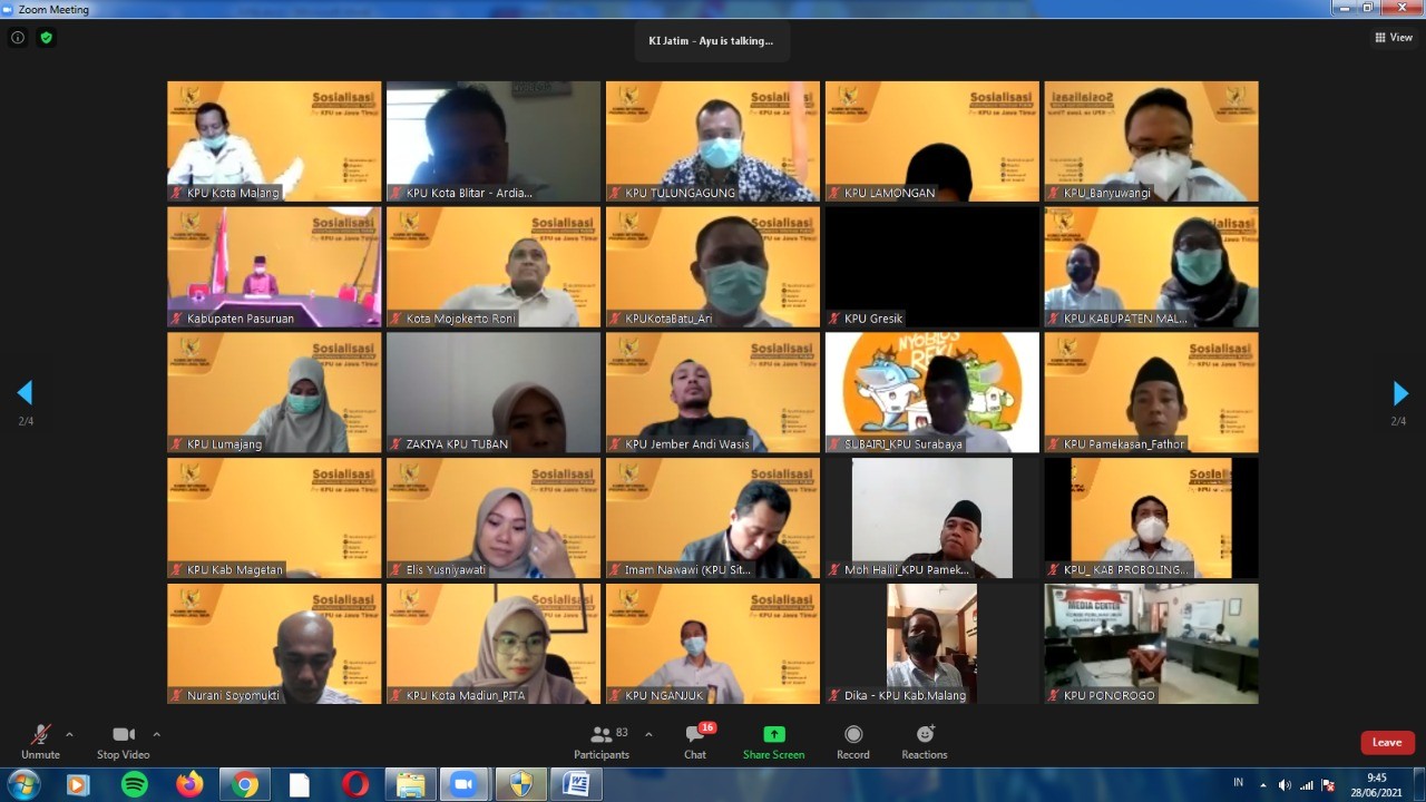 Hupmas, SURABAYA- Senin (28/06/2021) Komisi Informasi Publik Provinsi Jawa Timur mengadakan Sosialisasi KIP kepada KPU Se-Jawa Timur secara virtual. Mengawali acara Ketua KPU Provinsi Jawa Timur, Choirul Anam memberikan kata sambutan. “Keterbukaan informasi menjadi poin penting dan selalu kita lakukan dijajaran kita sebagai spirit kinerja kami,” kata Anam. Lebih lanjut pria yang pernah menjabat sebagai Komisioner KPU Surabaya ini menyampaikan salah salah satu prinsip sukses pemilu adalah adanya keterbukaan atau transparansi informasi. “Kami juga sudah membentuk tim PPID dan kita juga ada tim pemberitaan. Sehingga masyarakat bisa mengakses informasi di KPU,” lanjutnya kembali. Acara berikutnya dilanjutkan dengan sambutan dan sekaligus membuka acara oleh Ketua KIP Jawa Timur, Imadoeddin. “Kami ucapkan banyak terima kasih atas kehadiran dan partisipasi seluruh jajaran KPU Jawa Timur dan KPU Kabupaten/Kota di Jawa Timur. Kegitan ini adalah tindak lanjut dari kegiatan di Madiun untuk menyongsong pelaksanaan tahapan pada Pemilihan Tahun 2024,” kata Imadoeddin. Kegiatan ini menghadirkan beberapa narasumber diantaranya Herma Retno Prabayanti, Komisioner Bidang Advokasi., Sosialisasi dan Edukasi serta Komisioner Bidang Penyelesaian Sengketa Informasi, A. Nur Aminuddin. (aas/esar/hupmas)