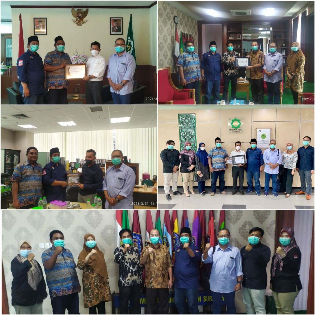 Hupmas, SURABAYA – Rabu pagi (31/3/2021), road show penyerahan piagam kepada para Panelis Debat Publik Pilwali 2020 berlanjut. KPU Surabaya beserta staf Sekretariat melakukan kunjungan ke kampus Universitas Muhammadiyah (UNMUH) Surabaya dan Universitas Islam Negeri Sunan Ampel (UINSA) Surabaya. Diawali kunjungan ke kampus UNMUH Surabaya untuk bertemu dengan Sukadiono selaku Rektor UNMUH Surabaya. Dalam sambutannya beliau menyampaikan senang bisa berinteraksi dalam Pilwali Tahun 2020 dan mengapresiasi peningkatan partisipasi masyarakat Surabaya pada masa pandemi. “Pilwali yang sukses, aman, kondusif, dan tetap menjaga komunikasi terlebih silaturahmi dengan kampus merupakan etika luar biasa dari KPU Surabaya,” jelasnya. Diakhir sambutan beliau meminta agar bisa menjaga amanah sampai akhir. Kunjungan berikutnya berlanjut ke kampus Universitas Islam Negeri Sunan Ampel (UINSA) Surabaya untuk bertemu dengan Masdar Hilmy selaku Rektor UINSA dan Rubaidi selaku dosen pengajar. Masdar menyampaikan ucapan terima kasih dan bangga serta tersanjung karena telah menggandeng UINSA menjadi bagian proses panjang Pilwali 2020. “Kami mengapresiasi kinerja KPU Surabaya yang telah sukses melaksanakan PilwaIi dengan baik,” ungkap rektor UINSA tersebut. Acara dilanjutkan penyerahan piagam penghargaan dan buku serta sesi foto bersama. (tika/esar/hupmas)