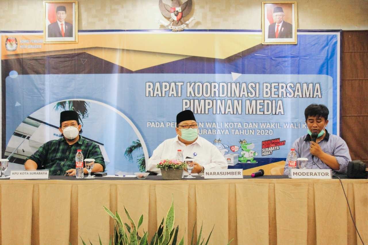 Hupmas, SURABAYA – KPU Kota Surabaya menggelar Rapat Koordinasi (Rakor) bersama pimpinan media dalam Pemilihan Wali Kota dan Wakil Wali Kota Surabaya tahun 2020. Bertempat di Grand Darmo Suite Jalan Progo nomor 1-3 Darmo, Wonokromo, Surabaya, Rakor mengundang 50 media massa baik dari media cetak, televisi, radio dan online. Menghadirkan pembicara dari Divisi Sosialisasi, Pendidikan Pemilih, Partisipasi Masyarakat dan SDM KPU Jawa Timur Gogot Cahyo Baskoro, dan Ketua Bawaslu Jatim Moh. Amin. Dipandu oleh moderator dari Komisioner KPU Kota Surabaya Divisi Sosialisasi, Pendidikan Pemilih, Partisipasi Masyarakat, dan SDM KPU Kota Surabaya Subairi. Dalam paparannya, Gogot menyampaikan menjelang masa tenang, KPU masih melakukan berbagai hal guna mempersiapkan pelaksanaan Pemungutan, penghitungan, dan rekapitulasi suara. “Beberapa hal yang kita lakukan selama masa tenang adalah pembersihan APK, penonaktifan medsos yang telah didaftarkan. Nanti pasca pilkada masih dapat dipakai lagi oleh kepentingan tertentu. kemudian juga tetap melakukan sosialisasi pada masa tenang,” jelasnya. Selain itu, Gogot juga menyampaikan, pihak media masih diperbolehkan untuk menyiarkan pemberitaan mengenai kampanye sesuai dengan peraturan perundang-undangan. “Selama masa tenang, hanya saja ini catatannya, media massa cetak, elektronik, dan lembaga penyiaran dilarang menyiarkan iklan rekam jejak Parpol atau Paslon atau bentuk lainnya yang mengarah pada kepentingan kampanye yang menguntungkan atau merugikan Paslon,” ungkap mantan Komisioner KPU Jember ini. Sementara itu, sebagai pembicara kedua, Moh. Amin Ketua Bawaslu Jatim menyampaikan, keterlibatan masyarakat baik dari insan media perlu melakukan sinergitas untuk menentukan keberhasilan sebuah pemilihan. “Kenapa harus keterlibatan masyarakat menjadi indikator keberhasilan? Pertama kewajiban baik kpu dan bawasalu adalah mengembalikan hakikat dari pelaksanaan pemilihan. Dimana menurut undang-undang sudah kita sepakati bahwa pemilihan merupakan sarana masyarakat untuk menyampaikan kedaulatannya yang secara langsung menentukan nasib bangsa yang akan datang,” ungkapnya. (trisna/hupmas)
