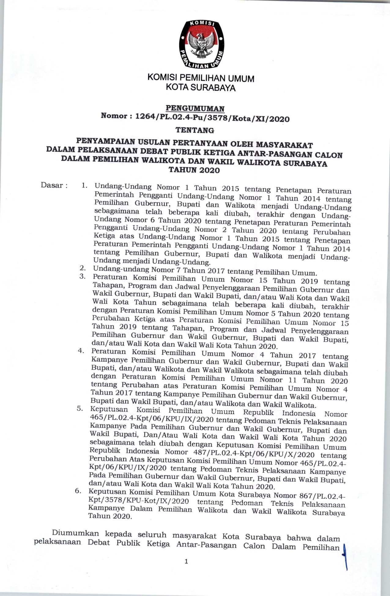 Dibuka oleh Ketua KPU Kota Surabaya Nur Syamsi. Dalam sambutannya, Nur Syamsi mengatakan, pelaksanaan debat publik ketiga perlu mempertimbangkan hasil evaluasi pada debat pertama dan kedua.