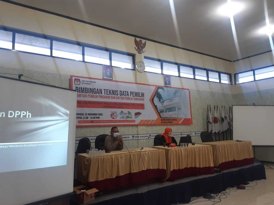 Hupmas, SURABAYA – Minggu (22/11/2020) KPU Kota Surabaya menggelar Bimbingan Teknis (Bimtek) Data Pemilih Daftar Pemilih Pindahan (DPPh) dan Daftar Pemilih Tambahan (DPTb) dalam Pemilihan Wali Kota dan Wakil Wali Kota Surabaya tahun 2020. Bertempat di Graha Swara lantai 3 Kantor KPU Kota Surabaya Jalan Adityawarman nomor 87, acara ini dihadiri 31 ketua dan divisi data PPK se wilayah Surabaya, Komisioner KPU Kota Surabaya Divisi Teknis Penyelenggaraan Soeprayitno, dan Komisioner KPU Kota Surabaya Divisi Perencanaan, Data, dan Informasi Naafilah Astri Swarist. Acara dibuka dengan sambutan dari Komisioner KPU Kota Surabaya Divisi Teknis Penyelenggaraan Soeprayitno. Dalam sambutannya, Soeprayitno mengapresiasi Ketua PPK beserta Divisi Data yang hadir guna mensukseskan Pemilihan Wali Kota dan Wakil Wali Kota Surabaya tahun 2020. “Kami ucapkan terima kasih yang sebesar-besarnya, karena hari minggu ini harusnya bapak/ibu semuanya berkumpul dengan keluarga tercinta guna memenuhi hak-hak jiwa anda. Namun dalam rangka ikhtiar kita bersama dalam rangka mensukseskan Pemilihan serentak lanjutan pada 9 Desember nanti harus hadir di Kantor KPU Kota Surabaya,” ungkapnya. Usai pembukaan dilanjutkan dengan pemaparan materi dari Komisioner KPU Kota Surabaya Divisi Perencanaan, Data, dan Informasi Naafilah Astri Swarist. Naafilah menyampaikan, dalam pemilihan kali ini KPU DPPh dan DPTB tetap dapat menggunakan hak pilihnya. “Kalau di pilkada kali ini namanya DPTb, yaitu pemilih yang tidak terdaftar dalam DPT tapi memenuhi syarat sebagai pemilih dan dilayani hak pilihnya menggunakan KTP elektronik mulai jam 12,” jelasnya. Selain itu, Naafilah juga menyampaikan materi tentang tata cara prosedur untuk menjadi DPPh, gerakan rekam KTP elektronik untuk pemilihan, gerkaan menjaga keamanan berkas DPT, cermat DPTb, dan perubahan formulir yang digunakan. (trisna/hupmas)