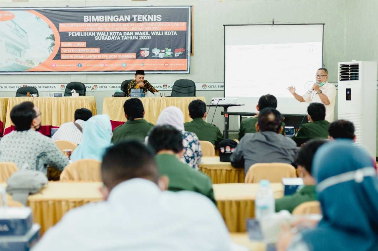 Hupmas, SURABAYA – Kamis Pagi (12/11/2020) Guna mensosialisasikan pemungutan, penghitungan dan penggunaan Sirekap, KPU Kota Surabaya menggelar Bimbingan Teknis (Bimtek) Pelaksanaan Pemungutan, Penghitungan, dan Penggunaan Sirekap kepada Panitia Pemilihan Kecamatan (PPK). Kegiatan yang digelar di Graha Swara lantai 3 Kantor KPU Kota Surabaya jalan Adityawarman nomor 87 merupakan gelombang pertama Bimtek. Diikuti oleh perwakilan 10 PPK di Surabaya, Yakni Asemrowo, Benowo, Bubutan, Bulak, Dukuh Pakis, Gayungan, Genteng, Gubeng, Gunung Anyar, dan Jambangan. Selain itu turut mengundang Bawaslu Kota Surabaya. Acara dibuka oleh Komisioner KPU Kota Surabaya Divisi Perencanaan, Data, dan Informasi Naafilah Astri Swarist . Dalam sambutannya, Naafilah mengatakan, dalam Bimtek kali ini, PPK diberikan bekal tentang penggunaan form-form baru yang akan dipakai dalam proses pemungutan, penghitungan, dan penggunaan Sirekap. “Penggunaan form-form baru ini nanti akan secara teknis dijelaskan oleh pak Nano, teman-teman PPK yang sebelumnya sudah menjadi penyelenggara, ada banyak perubahan formulir yang nanti perlu diketahui bersama,” jelas Naafilah. Usai sambutan, dilanjutkan dengan pre tes pemungutan, dan penghitungan suara. Kemudian dilanjukan dengan pemaparan materi dari Komisioner KPU Kota Surabaya Divisi Teknis Penyelenggaraan Soeprayitno. Soeprayitno menyampaikan, dari hasil Bimtek kali ini, diharapkan PPK telah memahami proses pemungutan, penghitungan dan penggunaan Sirekap, karena selanjutnya PPK berkewajiban untuk mensosialisasikan kepada PPS hingga nanti kepada KPPS. Tanggal 26 hingga 28 November Sirekap juga akan dibuka. Ini harapannya akan langsung diikuti oleh teman-teman KPPS dalam rangka simulasi. Selain itu antara tanggal 1-5 Desember, teman-teman KPPS juga akan dilibatkan langsung untuk kembali mengikuti uji coba penggunaan Sirekap,” jelasnya. (trisna/hupmas)