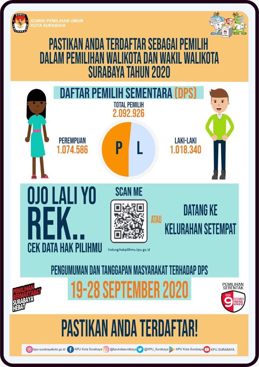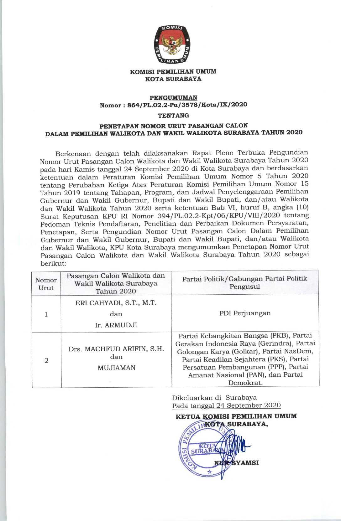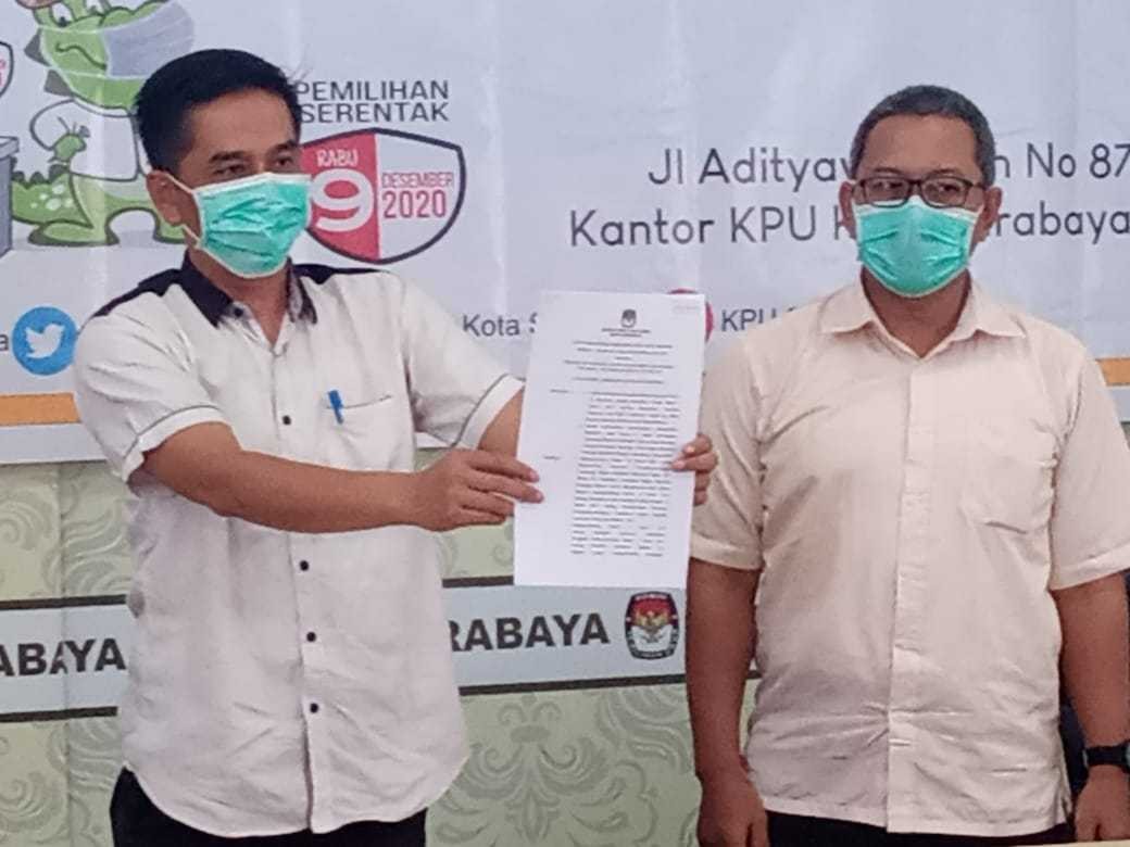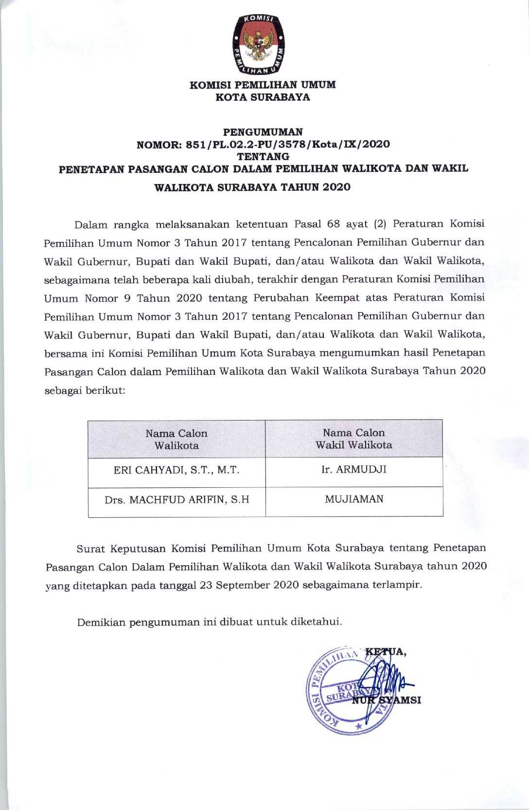 “KPU Kota Surabaya pada tanggal 23 september 2020 telah menetapkan bakal pasangan calon Eri Cahyadi dan Ir. Armuji sebagai pasangan calon peserta pemilihan dan Drs. Machfud Arifin SH dan Mujiaman sebagai pasangan Calon,” jelasnya.