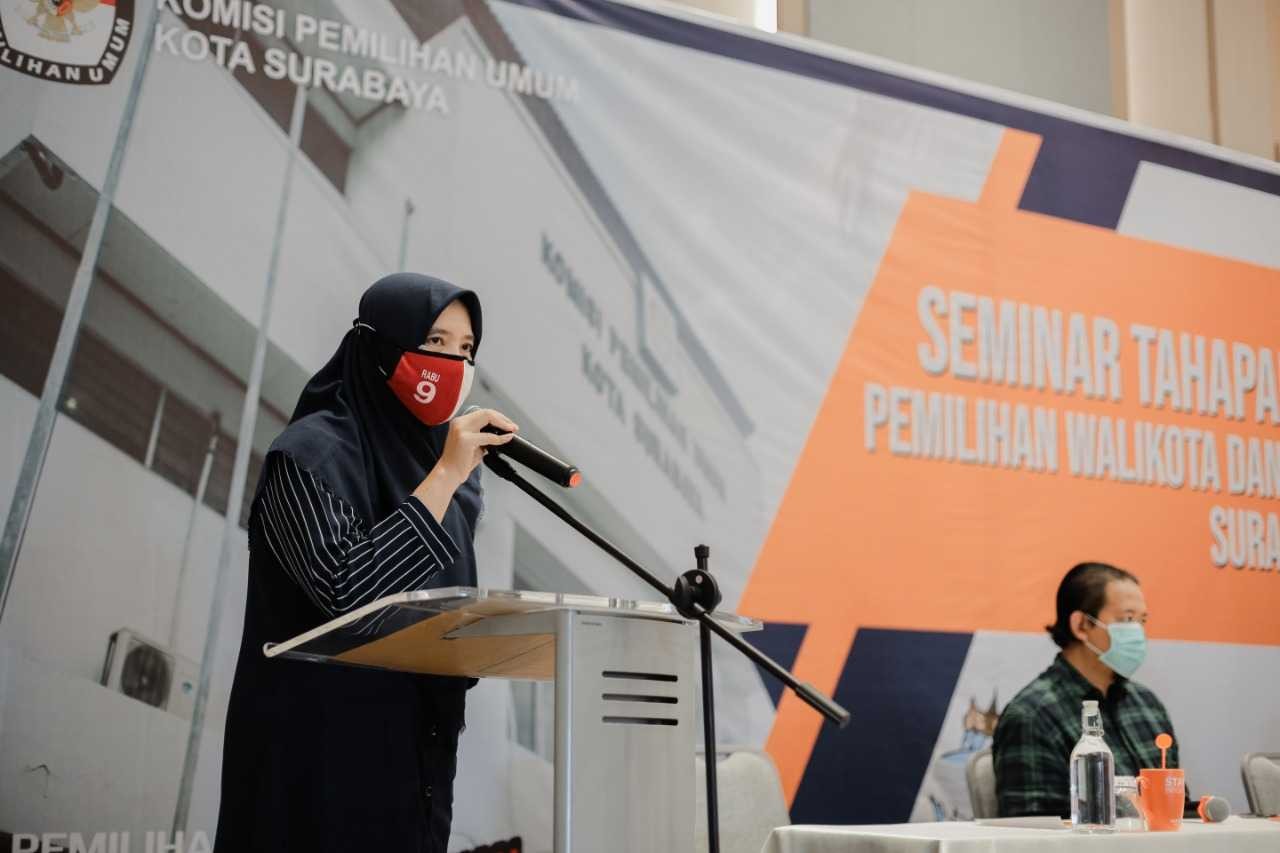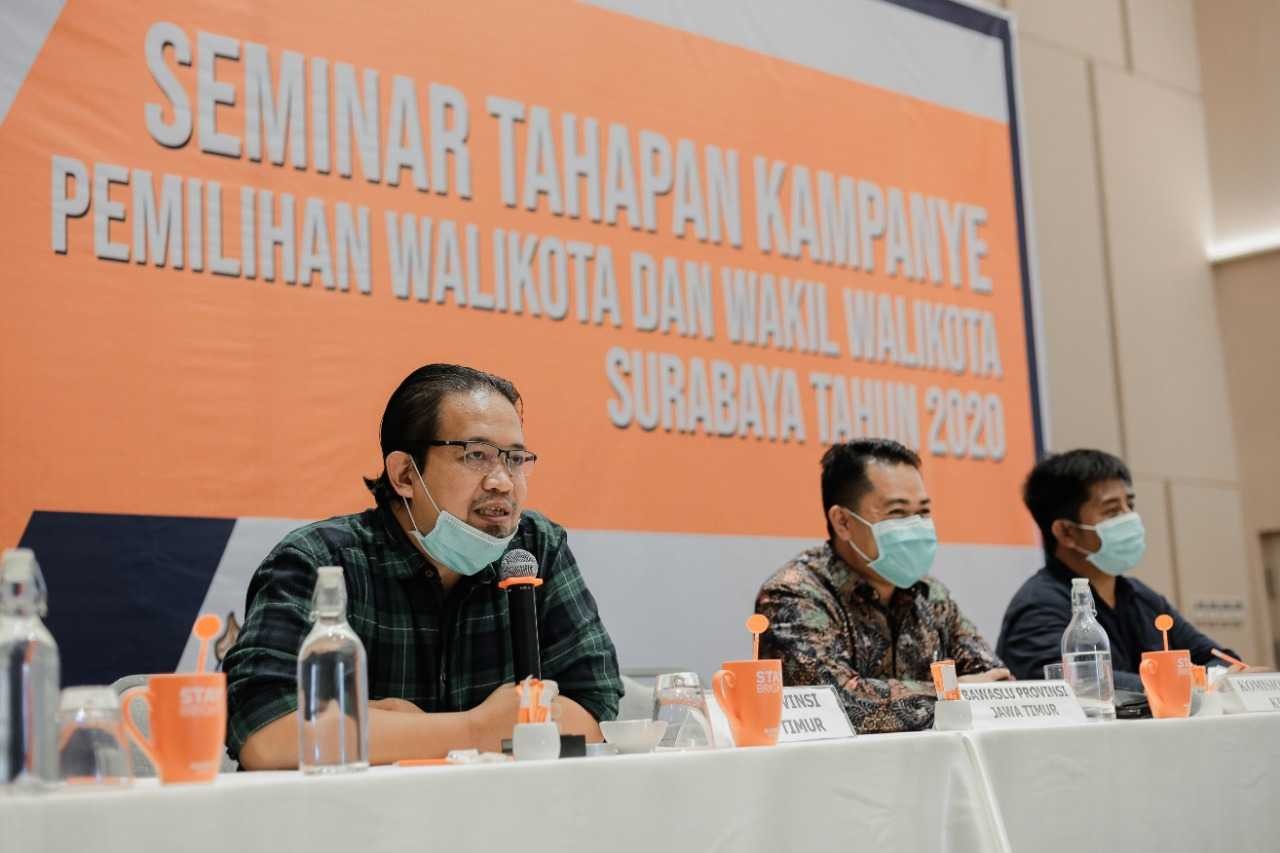 Hupmas, SURABAYA – Selasa (22/09/2020) KPU Kota Surabaya menggelar Seminar Tahapan Kampanye Pemilihan Wali Kota dan Wakil Wali Kota Surabaya Tahun 2020. Bertempat di Hotel Harris Surabaya Jalan Mayjen HR Muhammad No. 2A Sukomanunggal Surabaya. Acara dihadiri Bawaslu Kota Surabaya, perwakilan Partai Politik, Korem 084 Bhaskara Jaya, Polrestabes Surabaya, Polresta Tanjung Perak, Pemantau Pemilu, Organisasi Wartawan, dan jajaran OPD Pemkot Surabaya. Acara dibuka oleh Komisioner KPU Kota Surabaya Divisi Perencanaan, Program dan Data Naavilah Astri Swarist. Kemudian dilanjutkan dengan dengan penyampaian materi seminar.Dalam sambutannya, Naafilah mengatakan tahapan kampanye menjadi hal yang penting dalam mengenalkan pasangan calon beserta visi misinya. “Seminar ini akan banyak diulas mengenai regulasi dan aturan-aturan yang berkaitan dengan kampanye pada pemilihan Wali Kota dan Wakil Wali Kota Surabaya Tahun 2020,” jelasnya. Seminar kali ini menghadirkan pembicara Gogot Cahyo Baskoro Selaku Anggota KPU Provinsi Jawa Timur Divisi Sosialisasi, Pendidikan Pemilih, dan partisipasi Masyarakat dan Aang Kunaifi Koordinator Divisi Pengawasan Bawaslu Jawa Timur dan dimoderatori oleh Komisioner KPU Kota Surabaya Divisi Sosialisasi, Pendidikan Pemilih, Partisipasi Masyarakat, dan SDM Subairi. (trisna/hupmas)