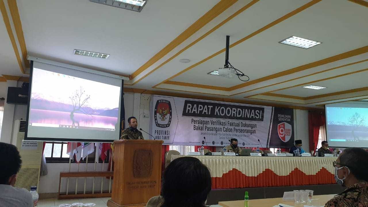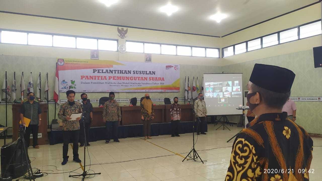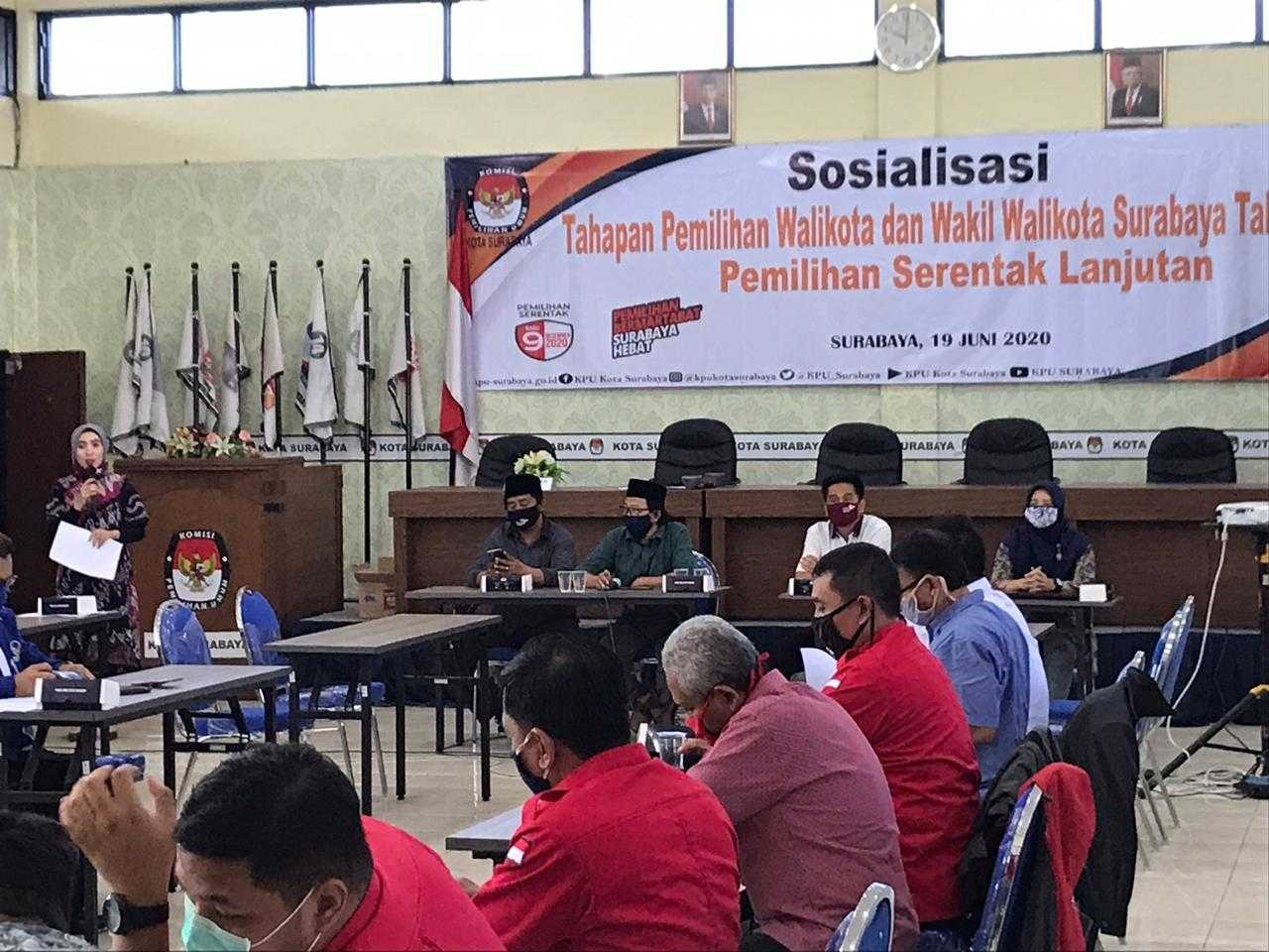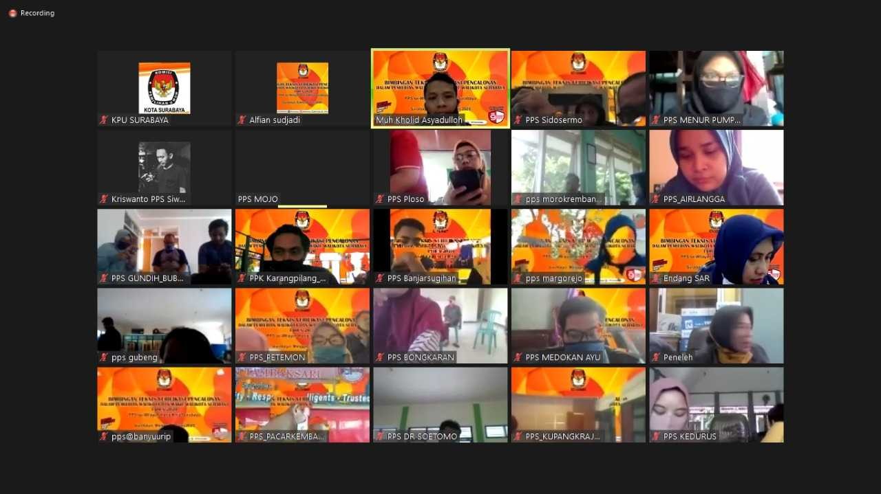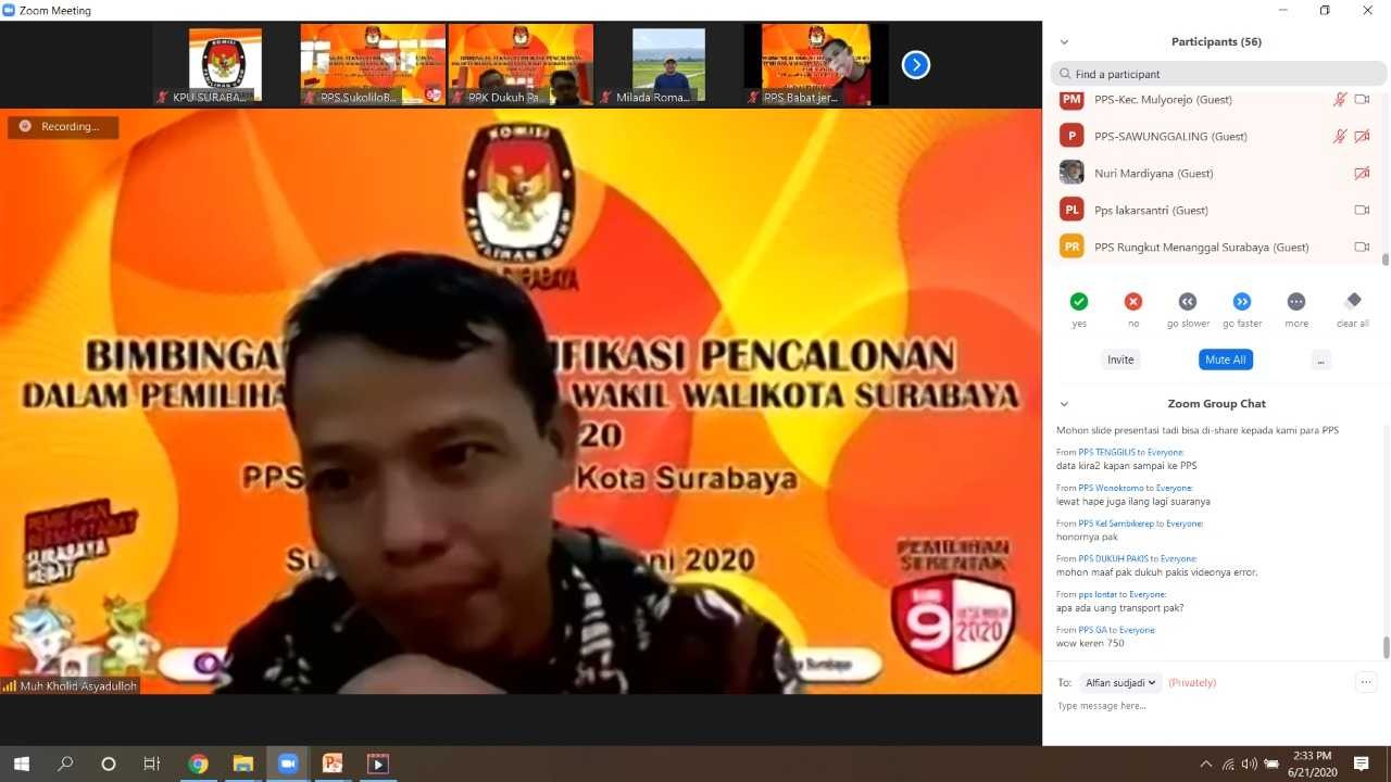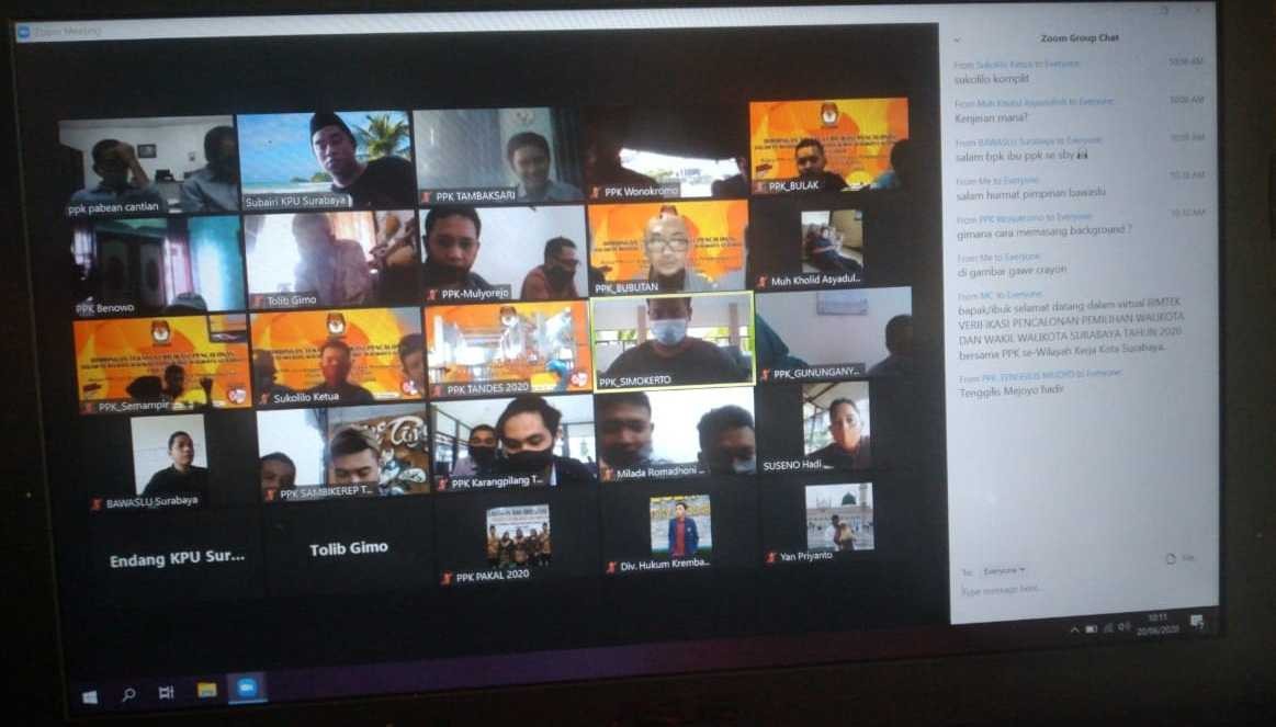 Hupmas, SURABAYA – Minggu pagi (21/06/2020) KPU Surabaya menggelar Bimbingan Teknis (Bimtek) Verifikasi Faktual Dukungan Bakal Pasangan Calon (Bapaslon) Perseorangan Dalam Pemilihan Walikota dan Wakil Walikota Surabaya Tahun 2020 melalui media dalam jaringan (daring). Dalam Bimtek Sesi 1 ini dihadiri Ketua dan Anggota Panitia Pemungutan Suara (PPS) di 16 kecamatan yaitu Karangpilang, Wonocolo, Rungkut, Wiyung, Tegalsari, Sawahan, Genteng, Gubeng, Sukolilo, Tambaksari, Simokerto, Pabean Cantian, Bubutan, Tandes, Krembangan dan Semampir. Acara Bimtek dibuka oleh Ketua KPU Surabaya, Nur Syamsi. “Verifikasi faktual PPS merupakan ujung tombak untuk melakukan verifikasi dengan beberapa metode yaitu ditemui secara sensus, didatangkan, dan melalui media teleconference,” jelas Syamsi. “Sudah tidak ada waktu untuk bersantai karena tahapan sudah dimulai dan verifikasi faktual bakal pasangan calon beririsan dengan pembentukan PPDP. Selamat menjalankan tugas dan jaga kekompakan,” kata Syamsi, sapaannya. Soeprayitno Divisi Hukum dan Pengawasan menyampaikan PPS merupakan garda terdepan dalam verifikasi ini sehingga perlu dibekali dengan Alat Pelindung Diri (APD) karena menjadi bagian item pengawasan oleh Bawaslu,” jelasnya. Pria yang biasa disapa dengan Mas Nano ini juga berpesan agar didokumentasikan seluruh kegiatan verifikasi faktual ini. Sementara itu, Subairi Divisi Sosdiklih, Partisipasi Masyarakat, dan SDM menyampaikan pembentukan PPDP akan ada bimtek tersendiri melalui PPK untuk disampaikan kepada PPS. Puncak acara inti pemaparan lebih detail dari Divisi Teknis Penyelenggaraan KPU Surabaya, Muh. Kholid Asyadulloh. Kholid memaparkan materi tentang Verifikasi Faktual Dukungan Bakal Pasangan Calon Perseorangan yang meliputi tanggal pelaksanaan verifikasi faktual, jenis formulir, langkah-langkah verifikasi faktual, dan rekapitulasi di tingkat kecamatan. (tika/esar)