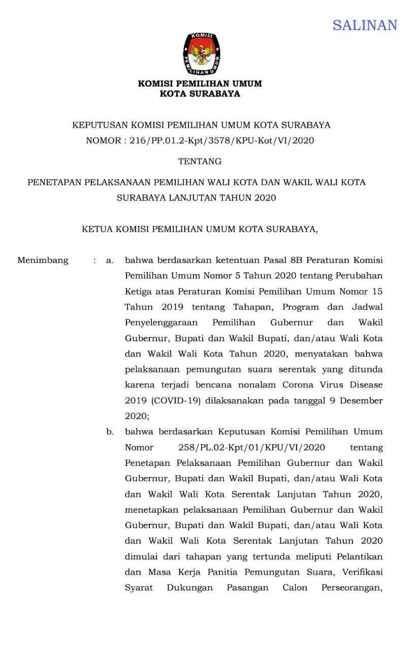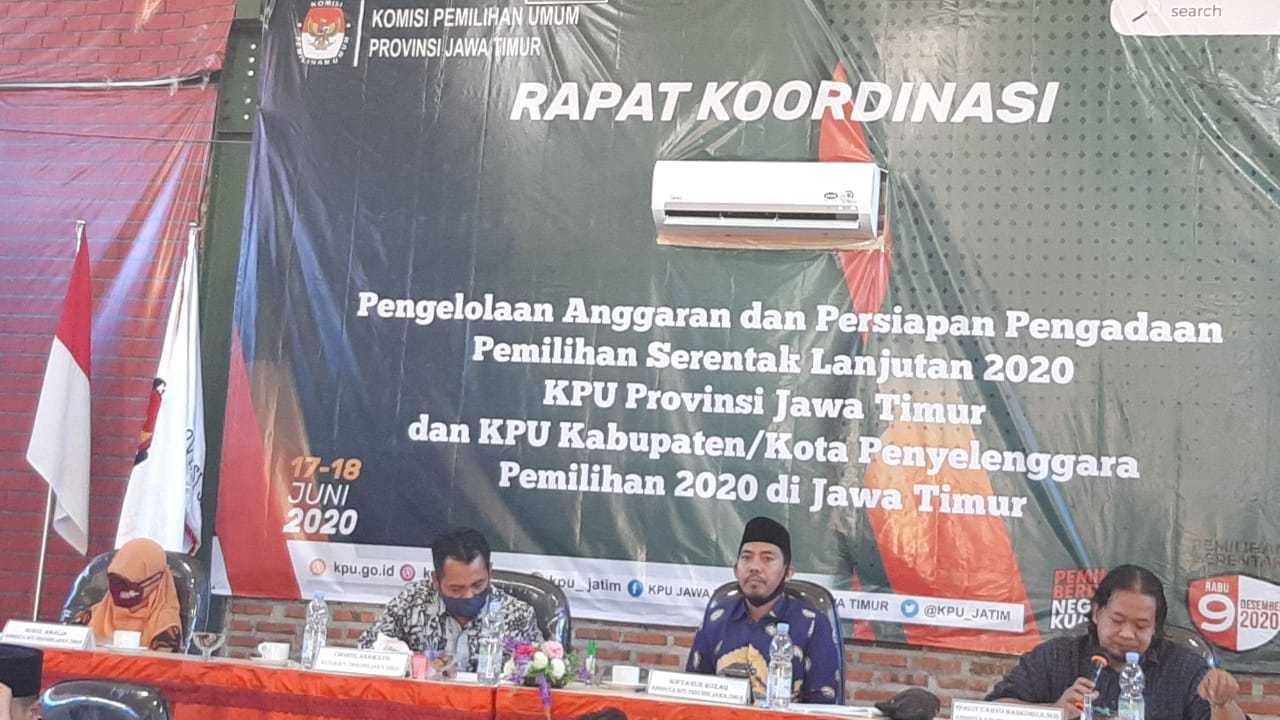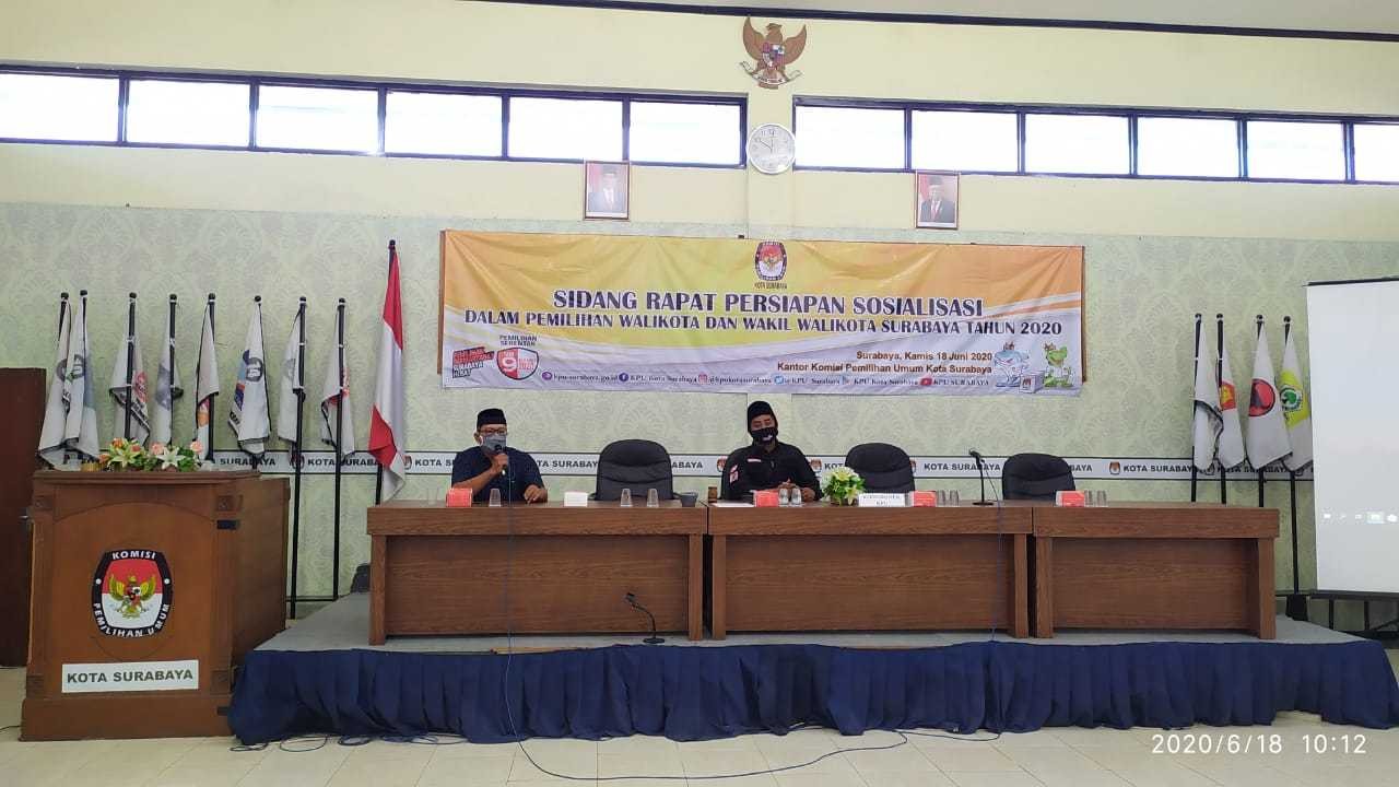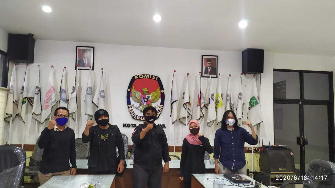 Hupmas, SURABAYA – Kamis siang (18/06/2020) KPU Surabaya mengundang Pemenang Maskot, Mars, dan Jingle dalam Rapat Sosialisasi Pemilihan Wali Kota dan Wakil Wali Kota Surabaya Tahun 2020. Acara selain dihadiri oleh Pemenang Juara 1 Lomba Maskot, Mars, dan Jingle turut pula dihadiri pemerhati seni Wahyu Widodo. Rapat yang berlangsung di ruang sidang lantai 1 dibuka oleh M. Kholid Asyadulloh selaku Divisi Teknis Penyelenggaraan. “Tertundanya tahapan ini dikarenakan pandemi covid-19 yang semula pelaksanaan pemungutan suara pada tanggal 23 September 2020 menjadi 9 Desember 2020. Karena ada perubahan tanggal ini perlu ada perubahan tanggal di lirik Mars dan Jingle,” jelas Kholid. Selanjutnya Subairi Divisi Sosdiklih, Partisipasi Masyarakat, dan SDM juga senada menyampaikan kepada para pemenang lomba untuk melakukan revisi karena ini terkait untuk bahan sosialisasi. “Untuk Mars dan Jingle lirik yang diubah adalah tanggal 23 September 2020 menjadi 9 Desember 2020 sedangkan Maskot perlu diberi aksesoris masker,” kata Subairi. Sesi terakhir acara rapat ditutup dengan foto bersama dengan para peserta. (tika/esar)