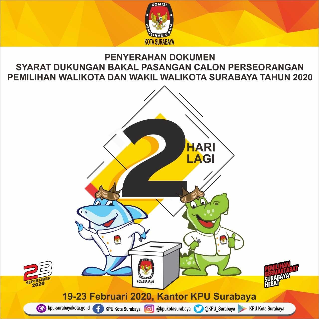 Sebagai informasi, jadwal penyerahan dokumen dukungan bakal pasangan calon perseorangan akan dilakukan selama 5 (lima) hari yang dimulai pada hari Rabu, 19 Februari 2020 sampai hari Sabtu, 22 Februari 2020 Pukul 08.00 WIB – 16.00 WIB dan hari Minggu, 23 Februari 2020, Pukul 08.00 – 24.00 WIB. (guh/esar)