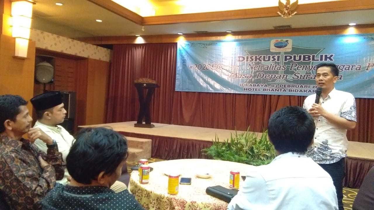 Hupmas, SURABAYA – Ketua KPU Surabaya, Nur Syamsi bersama Komisioner Divisi Hukum dan Pengawasan, Soeprayitno menghadiri diskusi publik bertema #2020Election: Netralitas Penyelenggara Pemilu, Masa Depan Surabaya.