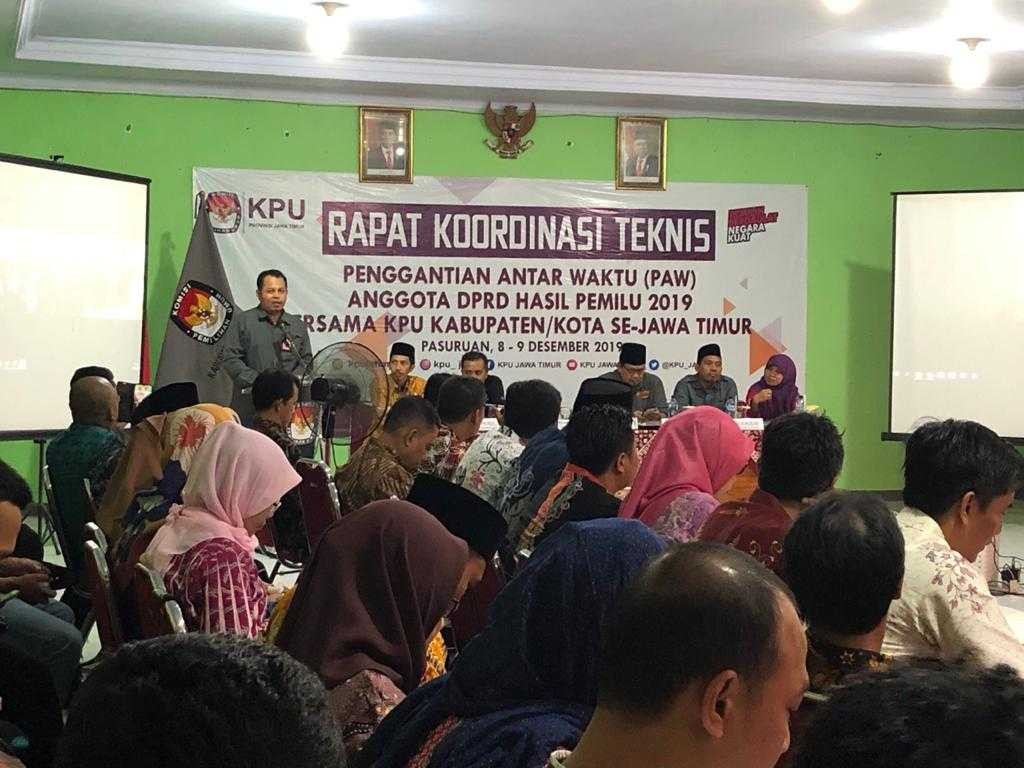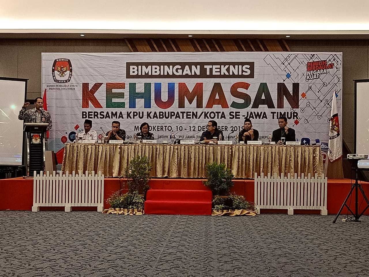 Hupmas, SURABAYA – Dalam rangka meningkatkan kapasitas kehumasan di lingkungan KPU Kabupaten/Kota se-Jawa Timur, KPU Provinsi gelar Bimbingan Teknis (Bimtek) Kehumasan di Hotel Ayola Sunrise Mojokerto, Jl. Benteng Pancasila No. 9, Kota Mojokerto. Acara yang berlangsung selama 3 (tiga) hari dimulai hari Selasa, tanggal 10 Desember 2019 sampai dengan hari Kamis, tanggal 12 Desember 2019 tersebut diikuti oleh 38 Ketua KPU Kabupaten/Kota dan Anggota KPU Kabupaten/Kota Divisi Sosdiklih, Parmas, dan SDM. Hadir mewakili KPU Surabaya, Subairi selaku anggota KPU Divisi Sosdiklih, Parmas, dan SDM bersama Naafilah Astri Swarist, Anggota KPU Surabaya Divisi Perencanaan, Data, dan Informasi. Choirul Anam, Ketua KPU Jatim menyampaikan dalam pembukaan bahwa tujuan kegiatan ini adalah untuk meningkatkan bidang kehumasan agar partisipasi masyarakat (parmas) dalam Pemilu dan Pemilihan menjadi lebih baik lagi. “Selama tiga hari ke depan, kita akan belajar kehumasan bersama narasumber yang berkompeten dalam bidangnya. Harapannya, agar semangat dalam kehumasan bisa mendorong partisipasi masyarakat dalam Pemilu dan Pemilihan,” jelas Choirul Anam. Sebagai informasi, dalam bimtek ini dibagi menjadi beberapa materi yang diisi oleh pemateri yang berasal dari berbagai kalangan, seperti dari dosen yang membidangi Public Speaking Universitas Airlangga, Presenter dari Trans TV dan CNN Indonesia, Komisioner KPU Jatim, dan pemateri dari PWI Jawa Timur.
