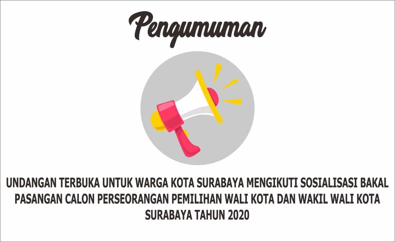 Hupmas, SURABAYA – Dalam rangka menindaklanjuti Pengumuman Komisi Pemilihan Umum Kota Surabaya Nomor 384/PP.04.3-Pu/3578/KPU-Kota/XII/2019 tanggal 3 Desember 2019 tentang Jadwal Penyerahan Dukungan Pasangan Bakal Calon Perseorangan Dalam Pemilihan Wali Kota dan Wakil Wali Kota Surabaya tahun 2020, dengan ini KPU Surabaya mengundang Bapak/Ibu/Saudara(i) Warga Kota Surabaya yang hendak mencalonkan sebagai Bakal Pasangan Calon Wali Kota dan Wakil Wali Kota Perseorangan tahun 2020 untuk hadir pada: Hari : Rabu Tanggal : 11 Desember 2019 Waktu : 13.00 WIB Tempat : kantor KPU Kota Surabaya, Jl. Adityawarman No. 87, Surabaya Catatan : Bagi Bakal Pasangan Calon Perseorangan atau tim Bakal Pasangan Calon Perseorangan harus membawa surat tugas/surat mandate dan diserahkan kepada KPU Kota Surabaya untuk mendapatkan username dan password SILON. Adapun surat tugas/surat mandat sebagaimana dimaksud tersebut harus memuat informasi : Nama Bakal Calon Wali Kota dan Wakil Wali Kota beserta gelar; Nomor Induk Kependudukan masing-masing Bakal Calon; Tempat dan tanggal lahir masing-masing Bakal Calon; Alamat masing-masing Bakal Calon; Jenis kelamin masing-masing Bakal Calon; dan Pekerjaan masing-masing Bakal Calon. Adapun undangan selengkapnya dapat diunduh di link berikut : Undangan Terbuka Perseorangan PILWALI 2020 (guh/esar)a