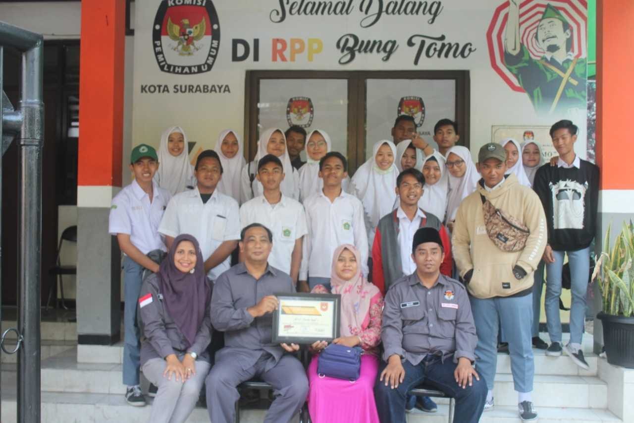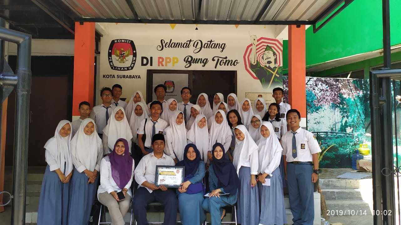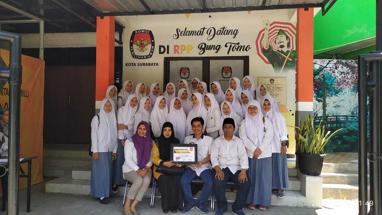 Hupmas, SURABAYA – Selasa (15/10/2019) sejumlah 31 pelajar MA Al Fatich hadiri undangan KPU Surabaya dalam kegiatan Audiensi dan Fasilitasi Rumah Pintar Pemilu (RPP) Bung Tomo. Atok Illah, selaku guru pendamping dalam memberikan sambutan menyampaikan apresiasi bisa menghadiri acara ini dan berpesan agar anak didiknya menularkan ilmu kepemiluan kepada teman sebayanya di sekolah. “Kami mewakili lembaga sekolah menyampaikan banyak terima kasih kepada KPU Surabaya atas undangannya. Selain itu, saya berpesan kepada siswa- siswi didik saya agar dapat dengan serius memperhatikan narasumber dalam menyampaikan materi sehingga setelah dari sini dan kembali ke sekolah ilmu tersebut bisa ditularkan ke teman-temannya,” ungkap Atok. Didapuk sebagai narasumber, Kholid Asyadulloh selaku Divisi Teknis Penyelenggaraan KPU Surabaya dalam menyampaikan materi meliputi cara menggunakan hak pilih, tujuan dan pentingnya Pemilu di Indonesia serta beberapa hal penting lain dalam kepemiluan. Menginjak sesi akhir siswa-siswi diajak untuk berkeliling di RPP Bung Tomo. Selain mengenalkan hal-hal penting berkaitan dengan kepemiluaan peserta juga diajak bermain game yang tersedia RPP (al/esar)