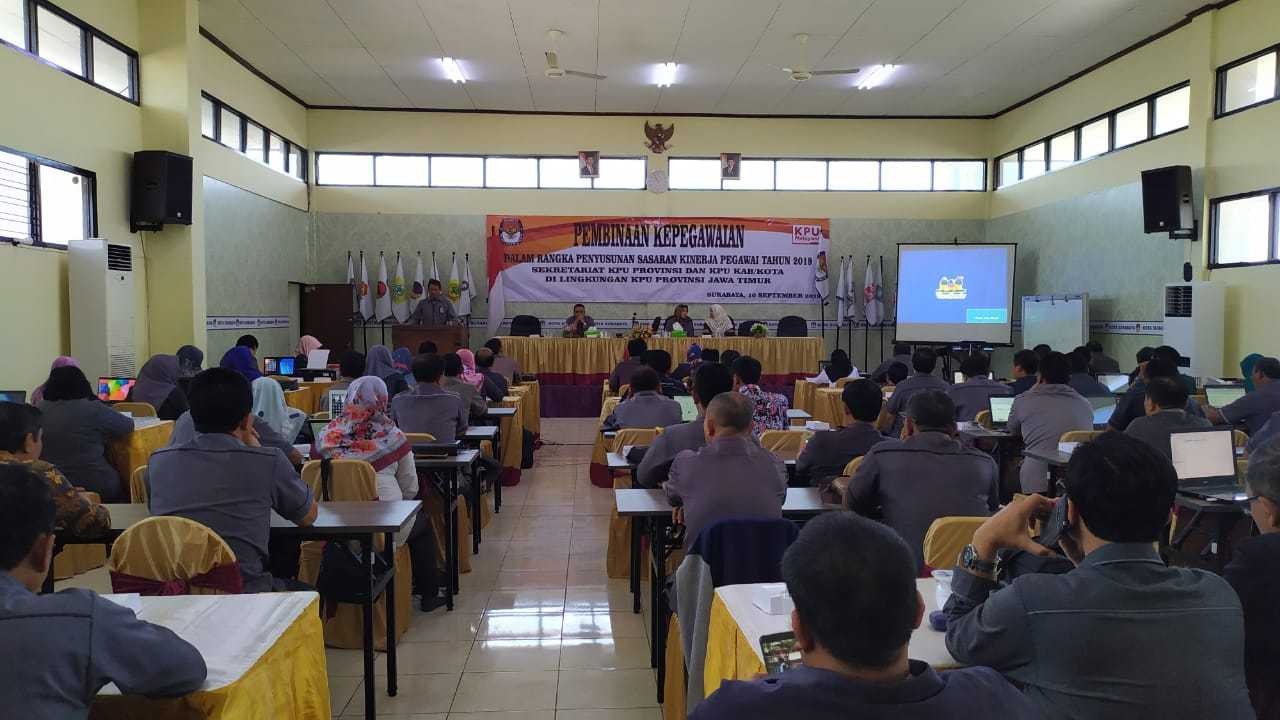 Hupmas, SURABAYA – Selasa (10/09/2019), KPU Provinsi Jawa Timur menggelar pembinaan kepegawaian dalam rangka penyusunan Sasaran Kinerja Pegawai (SKP) Tahun 2019 kepada 38 KPU Kabupaten/Kota di lingkungan KPU Provinsi Jatim. Acara yang berlangsung di Aula Graha Swara Lt. 3 Kantor KPU Kota Surabaya tersebut dihadiri oleh Sekretaris dan Kasubbag Keuangan, Umum, dan Logistik KPU Kabupaten/kota. Sekretaris KPU Jatim, Muhammad Eberta Kawima membuka acara dengan menyampaikan bahwa ini bimtek ini merupakan momentum yang penting dalam penyususan SKP, terutama Pegawai Negeri Sipil. “Membuat SKP ini menjadi wajib, karena ini merupakan bentuk pertanggungjawaban kinerja kita selama satu tahun kemarin dan juga menjadi penilaian oleh pimpinan kepada pegawainya,” jelas Sekretaris KPU Jatim yang akrab disapa Pak Wima. Untuk bimtek penyusunan SKP sendiri disampaikan oleh Kepala Sub Bagian Analisis Kebutuhan SDM dan Kesra KPU RI, Solikhah. Peserta diajak untuk mengisi formulir SKP secara langsung agar bisa mempraktekkan dan memahami tata cara pengisiannya. “Seperti yang sudah disampaikan oleh Pak Wima tadi, SKP ini sangat penting untuk pegawai. Jadi harus memahami dan mengerti cara untuk mengisinya. Setelah bimtek ini diharapkan semuanya bisa melakukan pengisian dengan baik dan benar,” ungkap Solikhah dalam mengisi materi tersebut. (guh/esar)