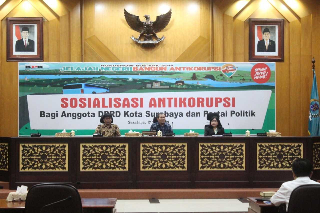 Hupmas, SURABAYA – Dengan mengusung tema “Sinergi Pemberantasan Korupsi untuk Mewujudkan Pemerintahan yang Bersih dan Berintegritas” KPK RI memberi pembekalan pada anggota DPRD Surabaya, calon anggota DPRD Periode 2019-2024, dan juga perwakilan Partai Politik yang hadir di acara Sosialisasi Anti Korupsi.
