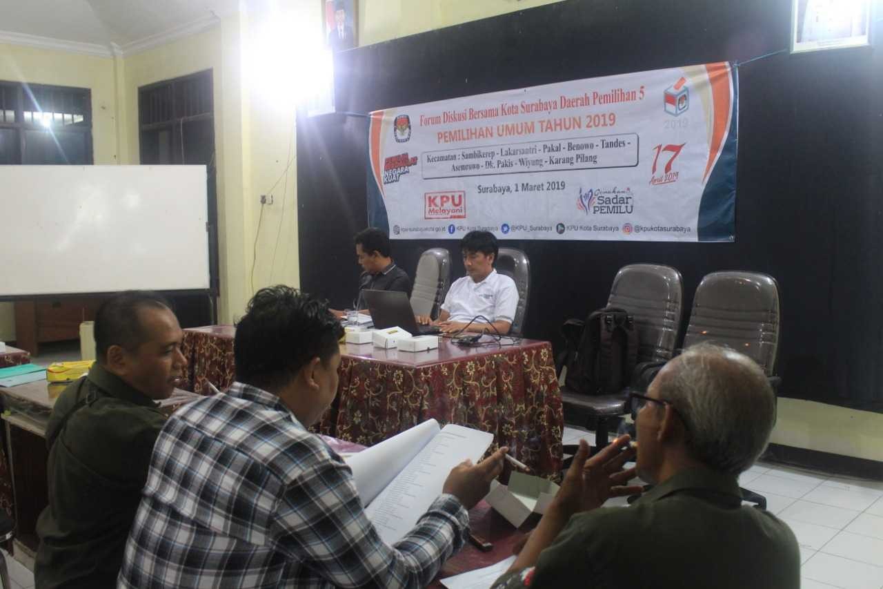 Hupmas, SURABAYA – Jum’at malam (01/03/2019), Panitia Pemilihan Kecamatan (PPK) yang tergabung dalam Dapil 5 (lima) Surabaya, yang meliputi PPK Asemrowo, Benowo, Dukuh Pakis, Karang Pilang, Lakarsantri, Pakal, Sambikerep, Tandes, dan Wiyung adakan diskusi bersama PKPU Nomor 3 Tahun 2019 tentang Pemungutan Suara (pungra) dan Penghitungan Suara (tungra).