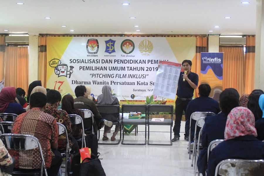 Hupmas, SURABAYA – Kamis siang (14/02/2019), KPU Surabaya menggandeng Dharma Wanita Persatuan Kota Surabaya mengadakan Sosialisasi dan Pendidikan Pemilih Pemilu 2019 dan Pitching Film Inklusi di Gedung Wanita Candra Kencana, Jl. Kalibokor Selatan No. 2 Surabaya. Sosialisasi pada siang hari ini dibuka langsung oleh Ketua Dharma Wanita Kota Surabaya Khusnul Ismiyati. “Semoga dengan adanya sosialisasi yang akan disampaikan KPU Surabaya dapat menjadikan sebuah pencerahan bagi kita semua yang hadir disini terkait dengan Pemilu 2019 mendatang,” demikian petikan sambutan dari Iis Hendro Gunawan begitu biasa disapa. Ketua KPU Surabaya, Nur Syamsi menjadi narasumber dalam sosialisasi yang dihadiri lebih dari 300 peserta siang ini. Dalam sosialisasi ini banyak dihadiri oleh Mahasiswa Unesa Surabaya, sehingga banyak informasi tentang Pemilu 2019 terhadap pemilih pemula atau pemilih muda salah satunya yaitu tentang pengurusan pindah memilih. “Bapak, Ibu serta kawan-kawan mahasiswa yang hadir disini, jika ingin pindah memilih bisa langsung mengurus form A5 untuk pindah memilih di PPS atau di Kantor KPU Surabaya sebelum tanggal 17 Februari 2019,” jelas Syamsi. (lay/esar)