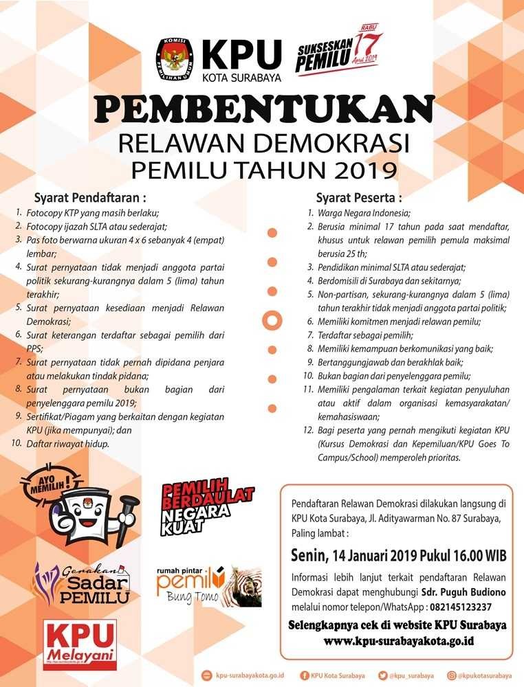 Hupmas, SURABAYA – Memasuki hari kedua pendaftaran pembentukan Relawan Demokrasi Pemilu 2019 di KPU Surabaya, Sabtu siang (12/01/2019) terlihat beberapa calon sudah menyerahkan berkas. Beragam motivasi yang mendorong mereka mendaftar, seperti yang disampaikan oleh M. Indra Kurniawan. Motivasi mendaftar karena ingin mengembangkan diri dan serta berpartisipasi. “Motivasinya lebih untuk mengembangkan diri dan berpartisipasi menjadi relawan demokrasi terutama sebagai pemilih pemula,” jelas Indra yang merupakan mahasiswa UINSA Surabaya. Senada dengan Indra, motivasi Novenia Hizkia Wulansari mendaftar sebagai Relawan Demokrasi adalah untuk mencari pengalaman serta ingin menginspirasi pemilih pemula untuk menggunakan hak suaranya. Relawan Demokrasi Pemilu 2019 merupakan program yang digagas KPU dengan melibatkan kelompok masyarakat yang berasal dari basis pemilih diantaranya basis keluarga, basis pemilih pemula, basis pemilih muda, basis pemilih perempuan, basis penyandang disabilitas, basis pemilih berkebutuhan khusus, basis kaum marginal, basis komunitas, basis keagamaan, dan basis warga internet. Melalui program ini, diharapkan mampu menumbuhkan kembali kesadaran terhadap pentingnya pemilu dan mampu menggerakkan masyarakat disekitarnya. Pendafatran Relawan Demokrasi di KPU Surabaya dibuka sampai dengan hari Senin, tanggal 14 Januari 2019 pukul 16.00 WIB. (guh/esar)