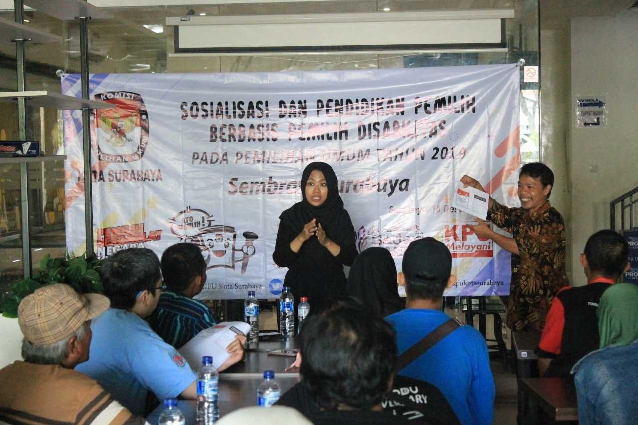 Hupmas, SURABAYA – Sabtu siang (15/12/2018), KPU Surabaya lanjutkan sosialisasi dan pendidikan pemilih Pemilu 2019 kepada Komunitas Difabel Sembrani Surabaya di Dot Com Cafe, jl. Raya Ngagel Jaya No. 86, Surabaya.