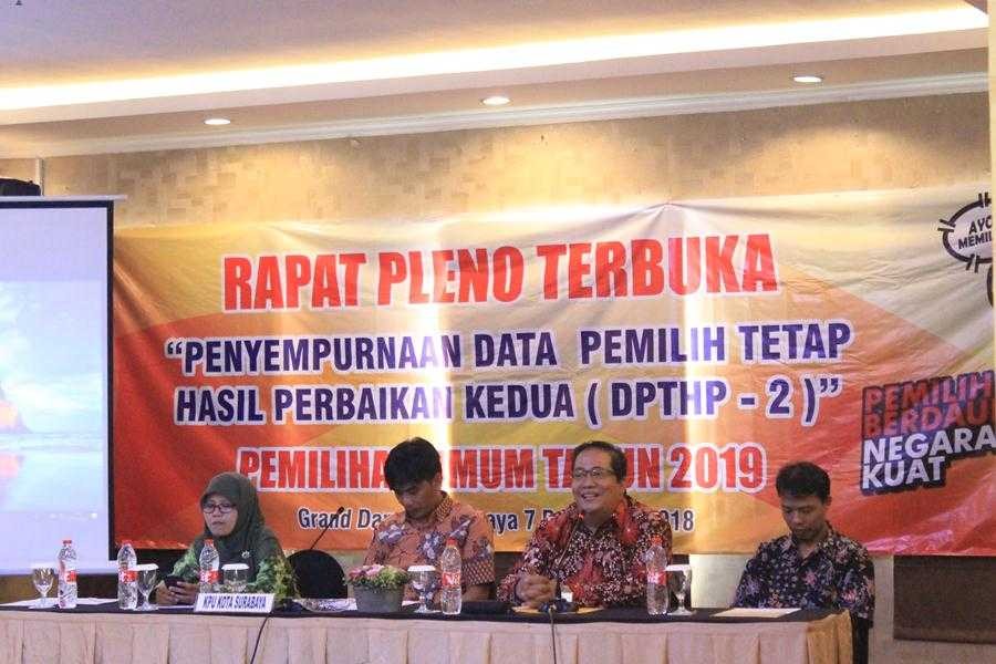 Hupmas, SURABAYA – Setelah melakukan pencermatan kembali Daftar Pemilih Tetap Hasil Perbaikan Kedua (DPTHP-2) sesuai dengan surat edaran KPU RI No. 1429 lalu, KPU Surabaya gelar Rapat Pleno Terbuka Penetapan Hasil Pencermatan dan Sinkronisasi Penyempurnaan DPTHP-2 Pemilu 2019, Jum’at siang (07/12/2018). Bertempat di Hotel Grand Darmo Surabaya, rapat pleno terbuka siang ini dihadiri oleh 16 LO Partai Politik peserta pemilu 2019, Bawaslu Surabaya, Bakesbangpol Surabaya, Polrestabes Surabaya, Polres Pelabuhan Tanjung Perak dan Panitia Pemilihan Kecamatan (PPK) se-Kota Surabaya. Rapat dibuka langsung oleh Ketua KPU Surabaya, Nur Syamsi. Selama rapat berlangsung dipimpin oleh Divisi Perencanaan, Data dan Informasi, Robiyan Arifin untuk membacakan hasil rekapitulasi penyempurnaan DPTHP-2 tingkat kecamatan se-Kota Surabaya. KPU Surabaya telah menetapkan hasil rekapitulasi penyempurnaan DPTHP-2 Pemilu 2019 yang semula 2.118.843 pemilih bertambah menjadi 2.131.756 pemilih dengan rincian 1.041.522 pemilih laki-laki dan 1.090.234 pemilih perempuan. Rapat pleno berakhir ditandai dengan pembacaan Berita Acara tentang Rekapitulasi dan Penetapan Penyempurnaan DPTHP-2 Tingkat Kota Surabaya Pemilu 2019 oleh Divisi Teknis dan Penyelenggara, Divisi Teknis. Lalu, BA tersebut diserahkan kepada Bawaslu Surabaya dan Parpol yang hadir. (lay)