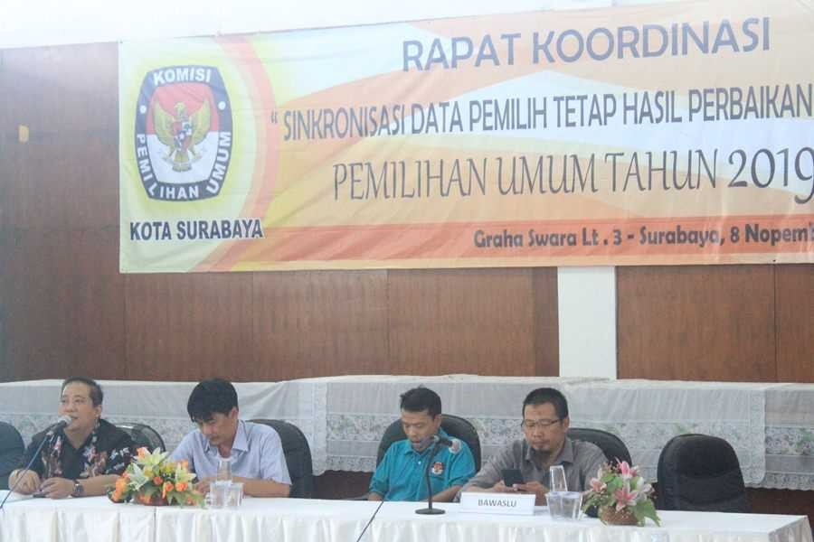 Hupmas, SURABAYA – Kamis siang (08/11/2018), KPU Surabaya menggelar Rapat Koordinasi (Rakor) Sinkronisasi Data Pemilih Tetap Hasil Perbaikan (DPTHP-2) Pemilihan Umum Tahun 2019. Rakor yang bertempat di Lantai III Graha Swara KPU Surabaya dibuka langsung oleh Ketua KPU Surabaya, Nur Syamsi. “Semoga Rakor siang ini akan membawa kebaikan kita bersama, saya harap nanti juga akan ada rekomendasi dari Bawaslu Surabaya atau masukan dari kawan-kawan Partai Politik Peserta Pemilu 2019,” ucap Syamsi dalam sambutannya. Peserta yang hadir adalah 16 Petugas Penghubung Partai Politik Peserta Pemilu 2019, Bawaslu Kota Surabaya, Panitia Pemilihan Kecamatan (PPK) se-Kota Surabaya, Bakesbangpol dan Linmas Surabaya, Polrestabes Surabaya, Polrestabes Tanjung Perak, dan Dinas Kependudukan dan Catatan Sipil Surabaya. Tujuan diadakannya Rakor hari ini yaitu untuk menyinkronisasikan data pemilih Pemilu 2019 yang dimiliki oleh Panitia Pemilihan Kecamatan (PPK) dengan data dari Bawaslu atau bahkan dari Parpol Peserta Pemilu 2019 sebelum ditetapkan menjadi DPTHP-2. “Mari kita selesaikan hari ini agar nanti saat pleno DPTHP-2 dapat menghasilkan data-data yang akan menjadi data awal untuk dapat menciptakan surat suara sekaligus juga akan menjadi data awal untuk distribusi surat suara per-TPS,” lanjut pria kelahiran Lamongan ini. (lay)