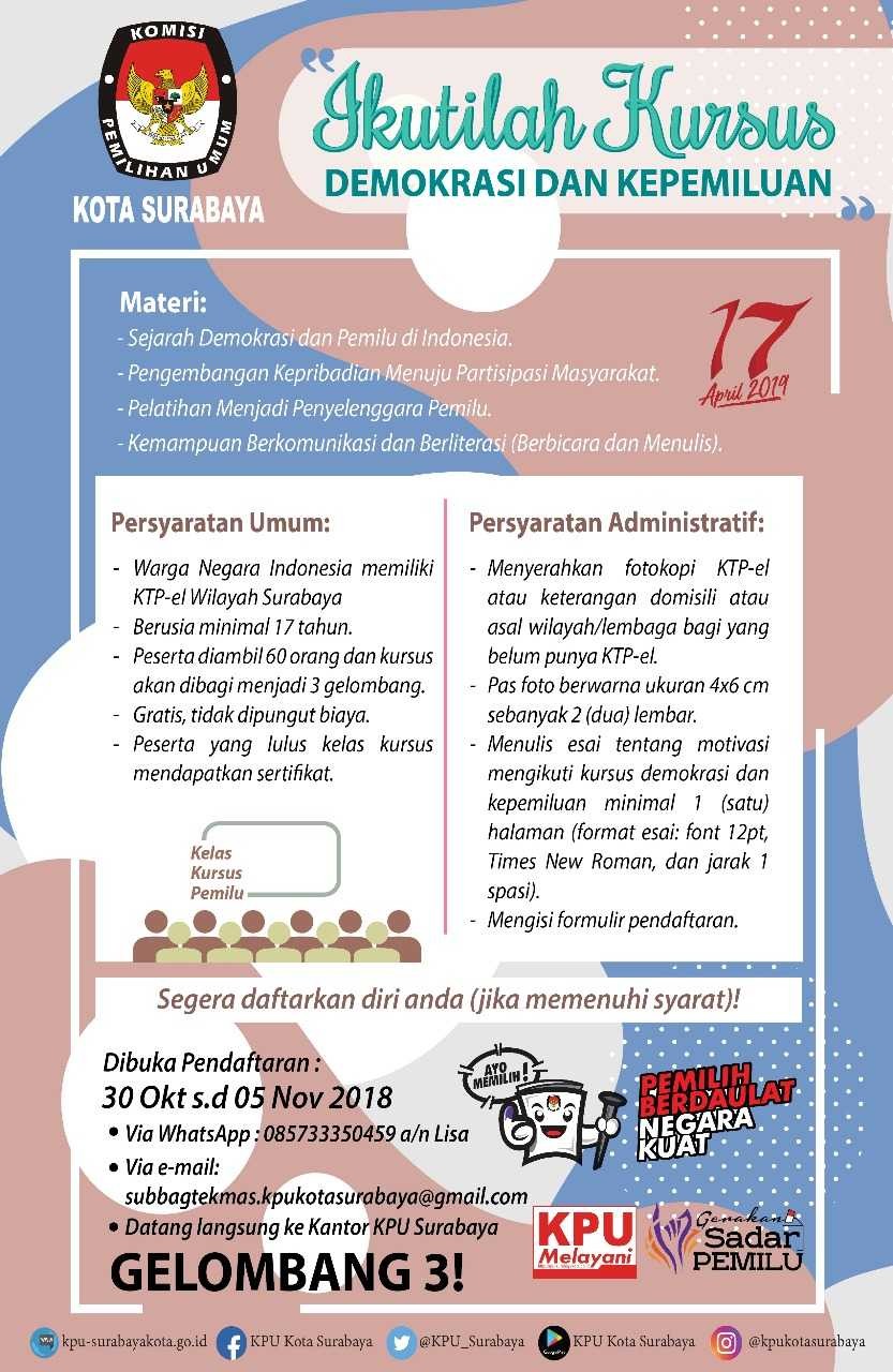 Kursus yang bertempat di Rumah Pintar Pemilu (RPP) Bung Tomo KPU Surabaya diikuti oleh 17 (tujuh belas) peserta dari berbagai latar belakang yang telah memenuhi persyaratan administrasi. Ada yang bekerja sebagai guru, mahasiswa/i, wiraswasta, karyawan swasta dan wartawan.